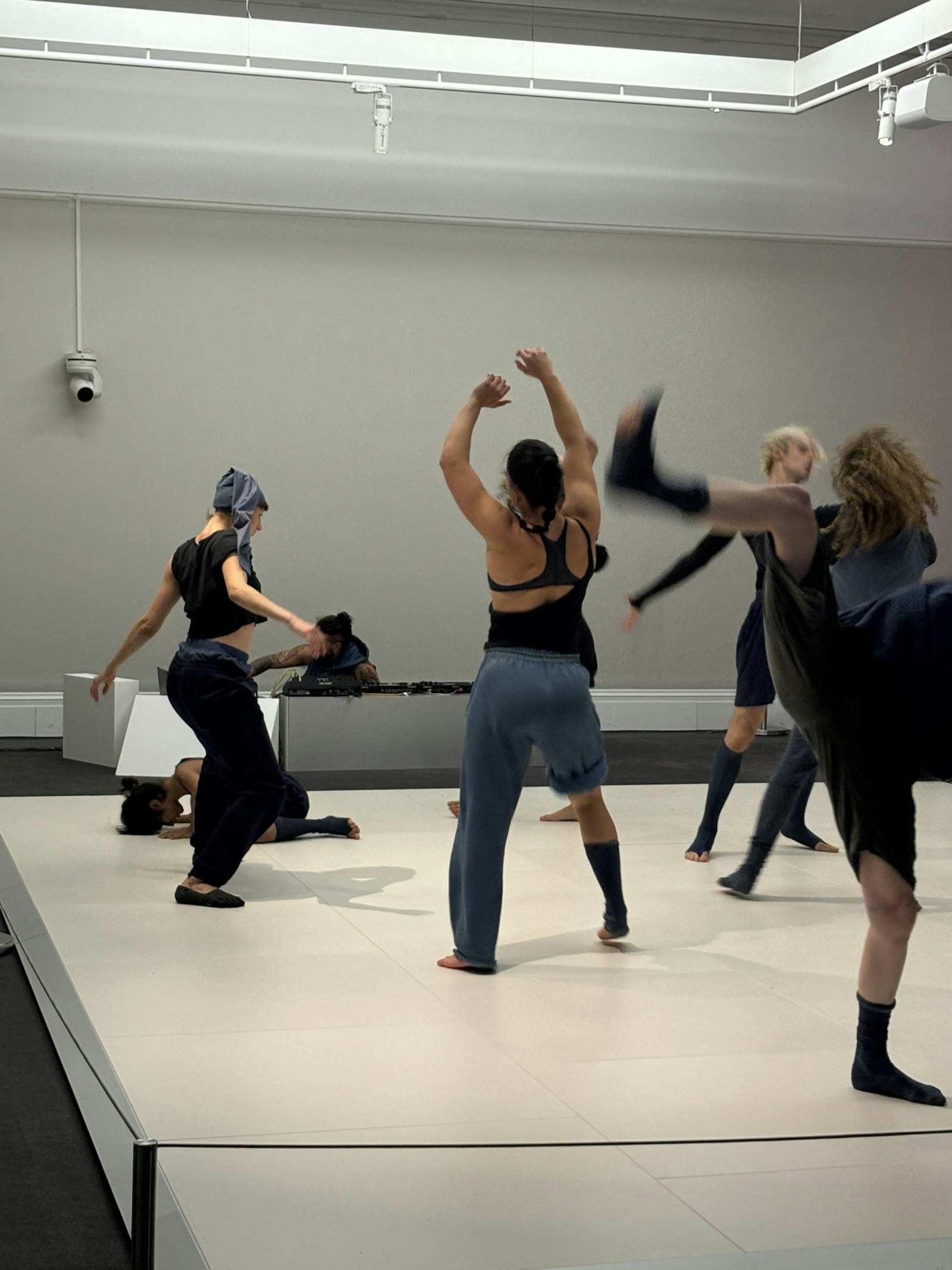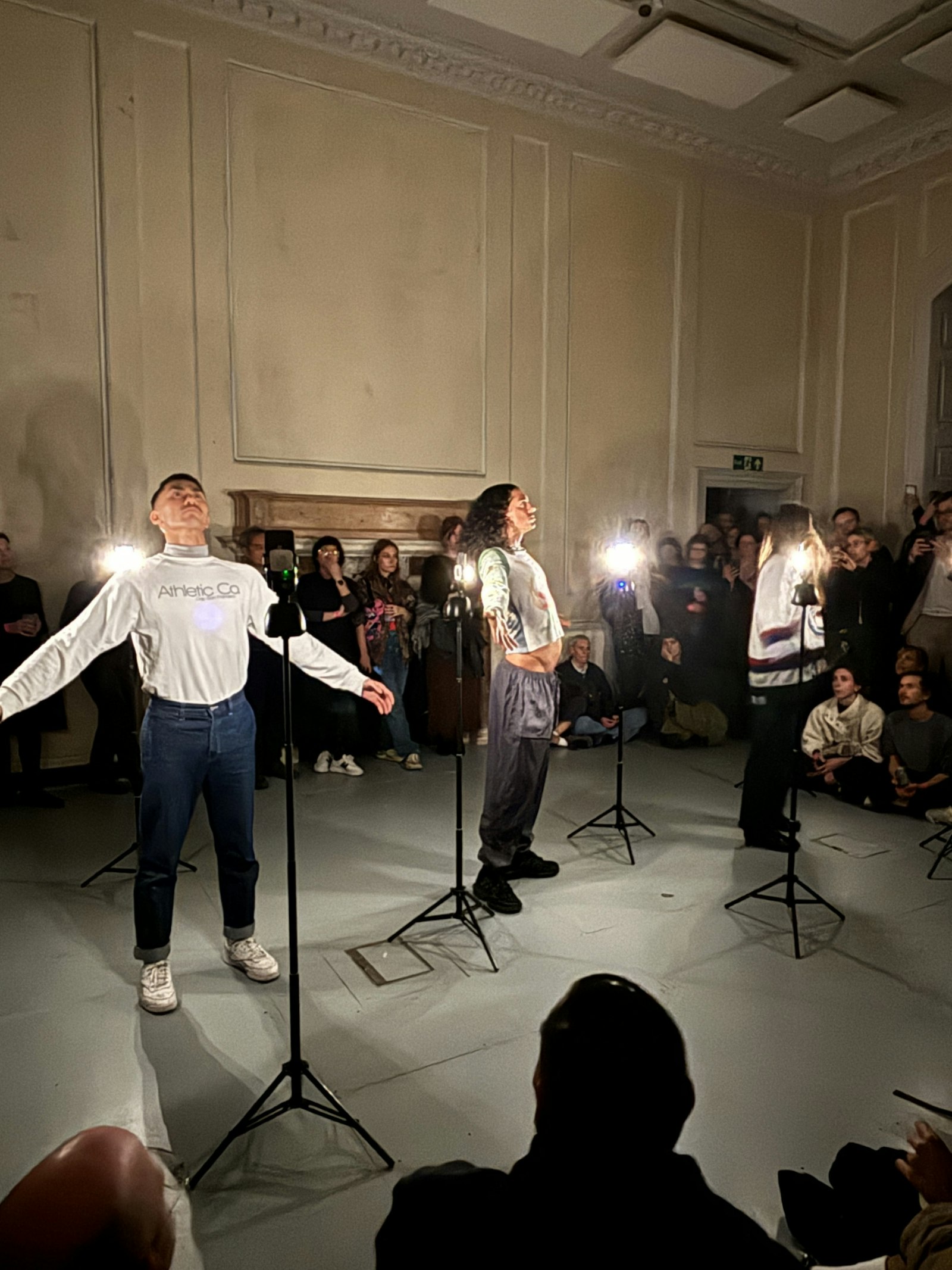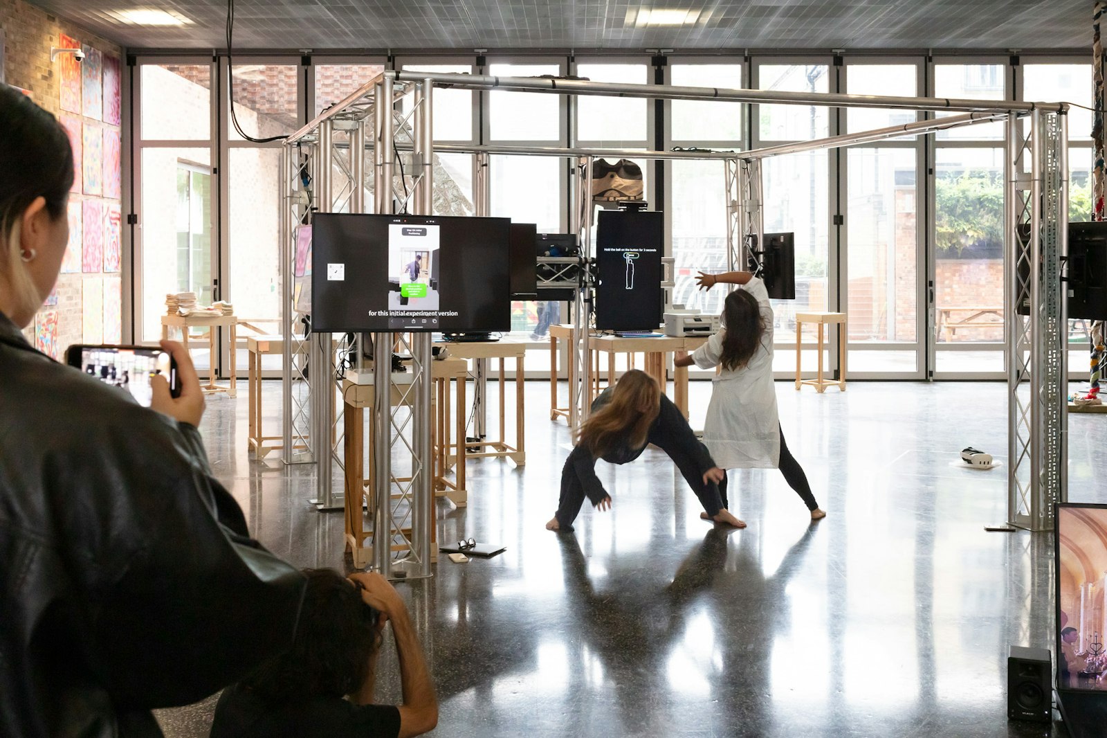Loosely choreographed dance bringing together two research projects at the Research Journeys exhibition in the Hangar Space, RCA 2025.