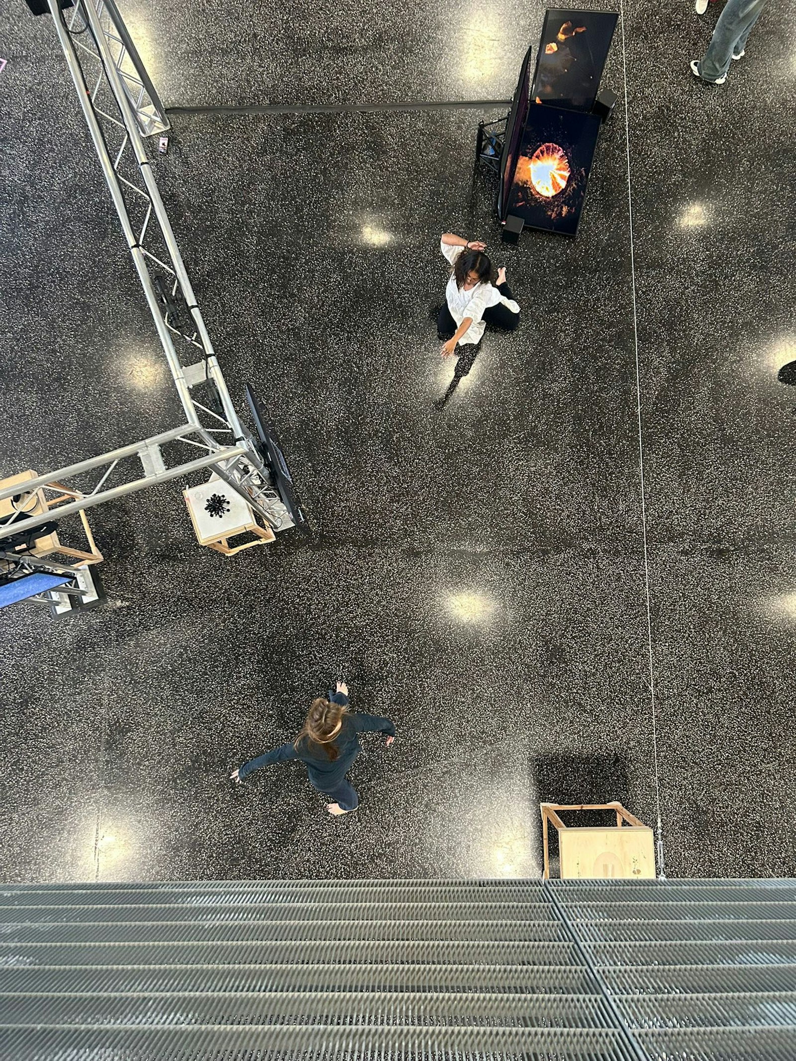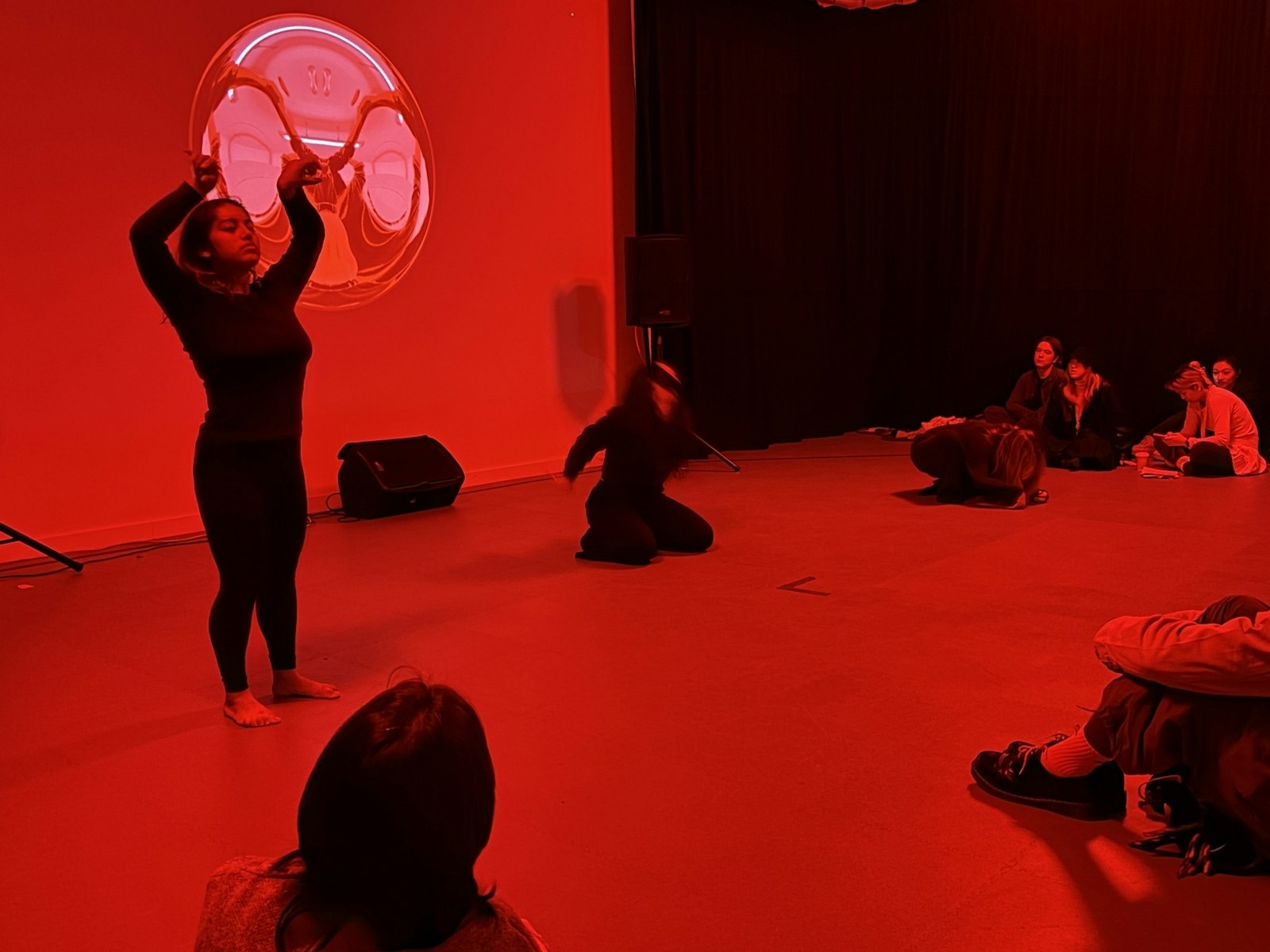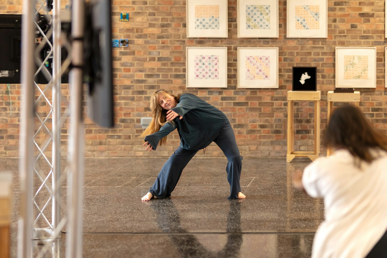 Loosely choreographed dance bringing together two research projects at the Research Journeys exhibition in the Hangar Space, RCA 2025.