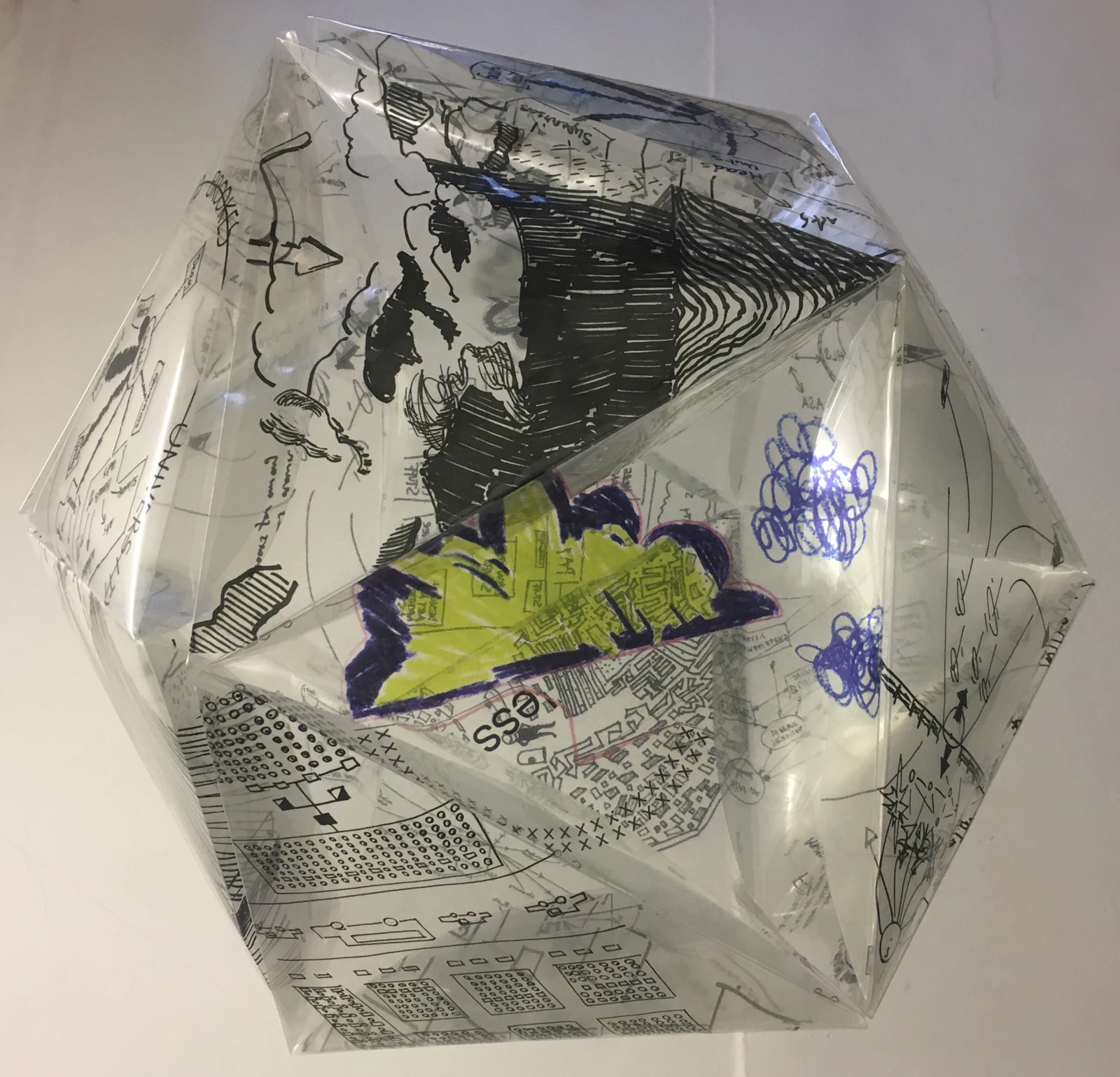 This icosahedron of transparent organisational drawings was constructed from the drawings of staff and students at Oxford Brookes University in January 2019. It provides a multi-faceted and mutli-layered view of the organisation through the organisational mental models of the participants. One person's mental model can be seen through the lense of another's.
