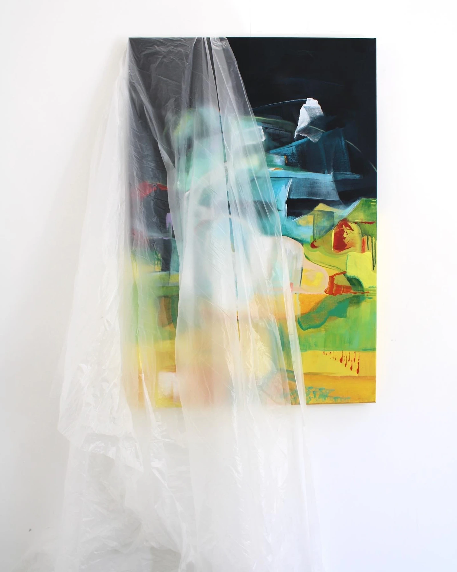 (1) Detail of Ruin Study 6, (with plastic sheeting) 2022 90cm x 60cm Acrylic limewash and mixed media on canvas, April 2022