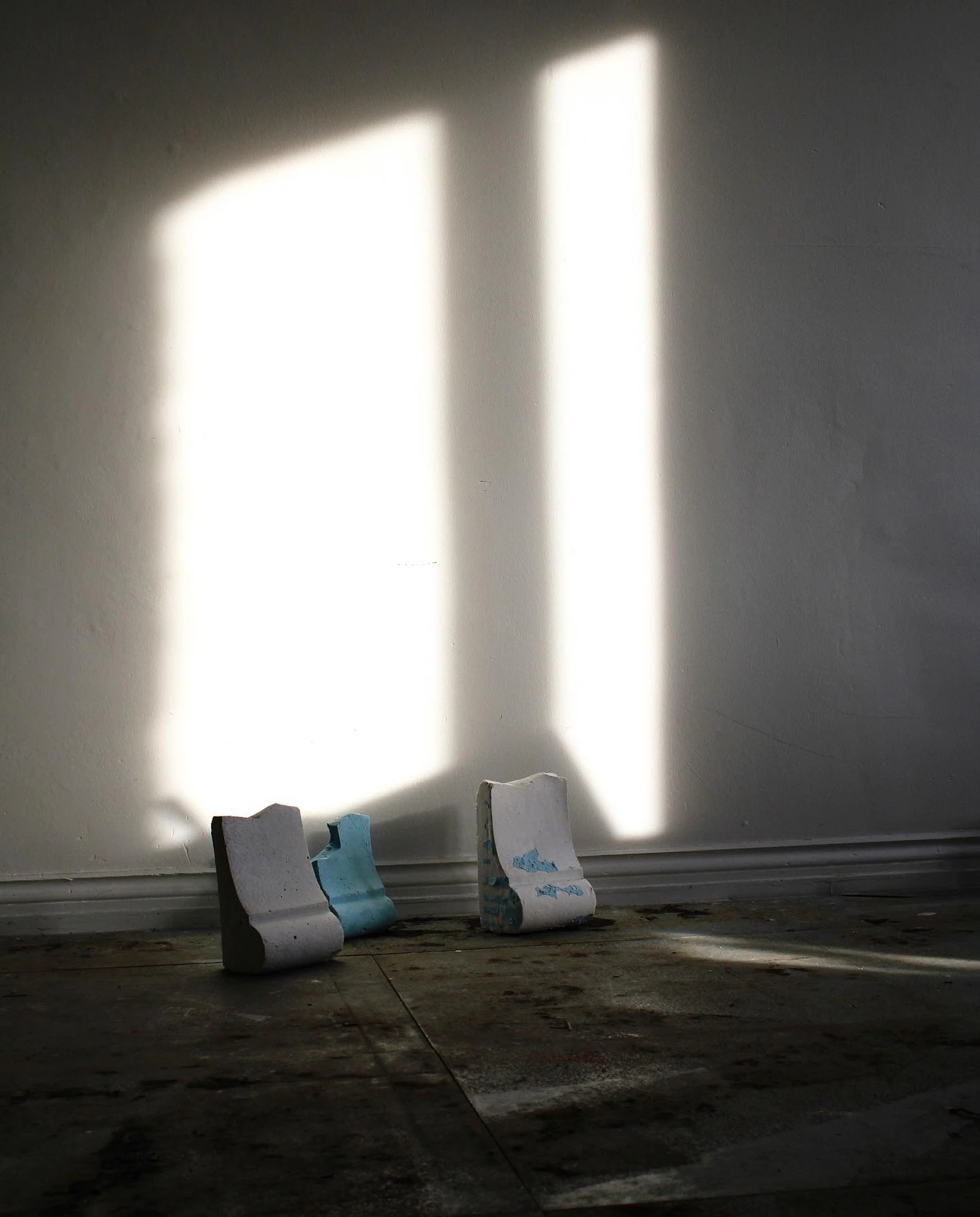 Theoretically influenced by contemporary object oriented ontologist Timothy Morton and eco-feminist thinkers such as Donna Harroway and Karan Barad , Sophie revisits themes of agency, affect, home, identity and loss from an expanded perspective within this research. Through the lens of a new and more-than-human vantage point in her research, she haunts, worries and re-members with the materiality of objects to re-present herself with other agents in the studio. Working through gestures of often site-specific material treatments, this project investigates the materiality of objects misremembered from her past to re-situate and ground a sense of herself in our ruined present.