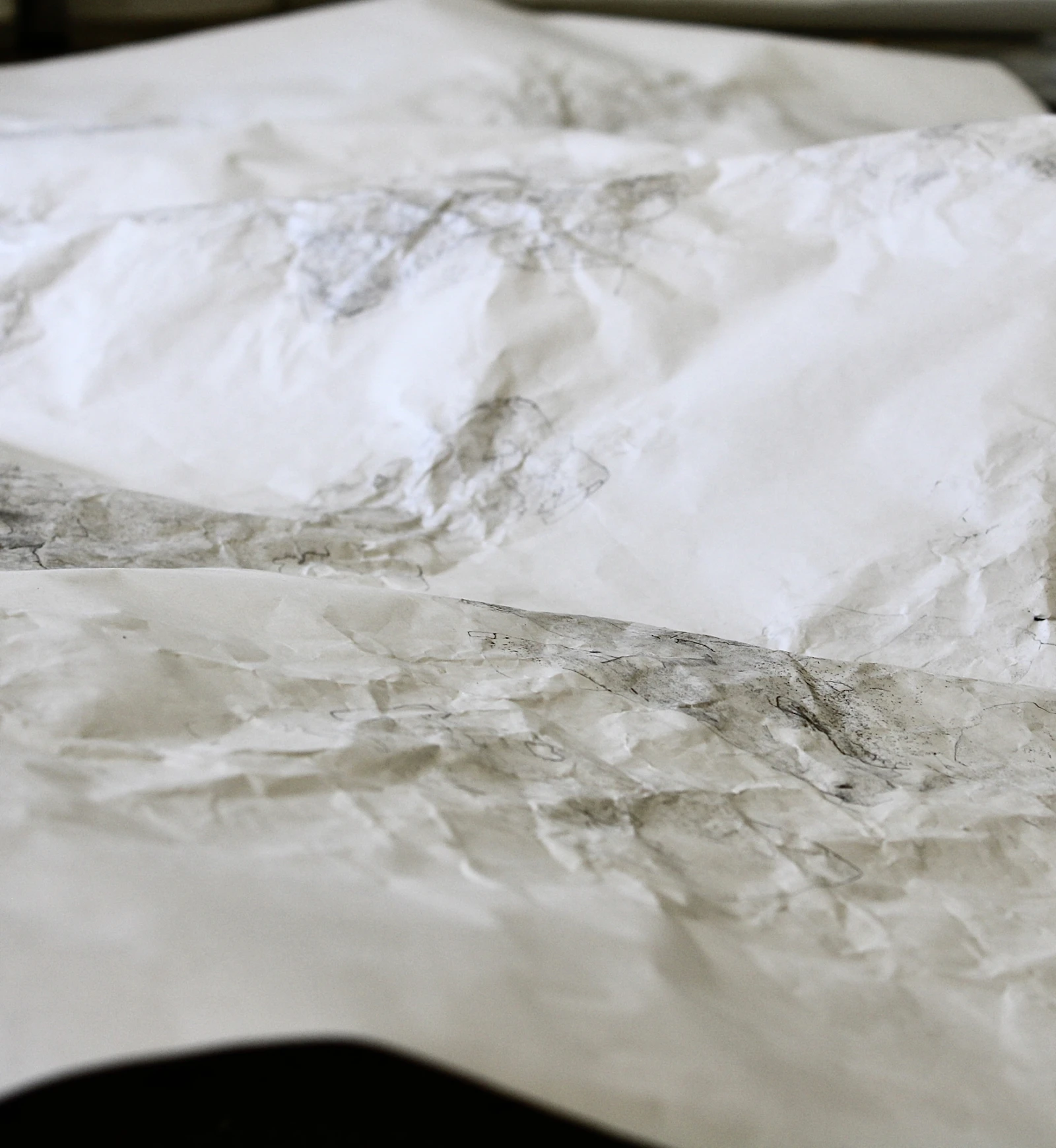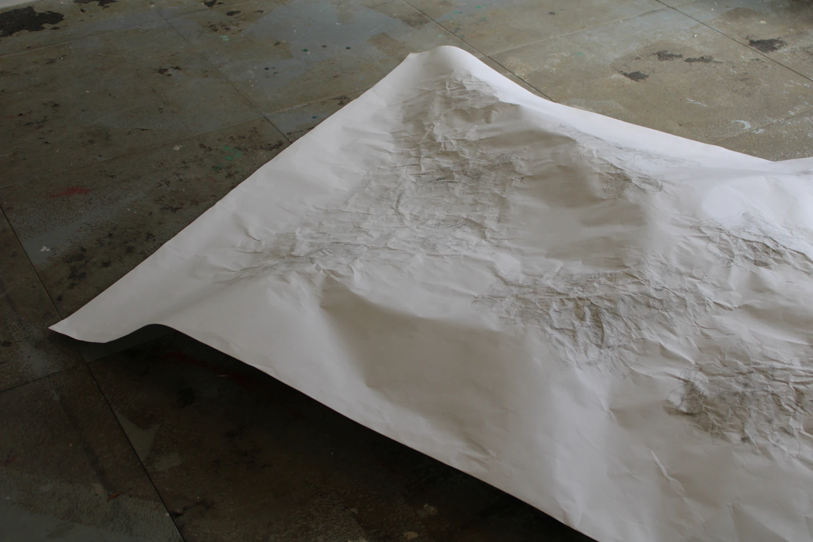 Image: Installation of Map of Woes, 2022. 2m x 3m. Graphite (carbon derivative) transfer paper, cartridge paper and pencil overlaid resting on plaster fragments of the limestone lintels. London. May 2022