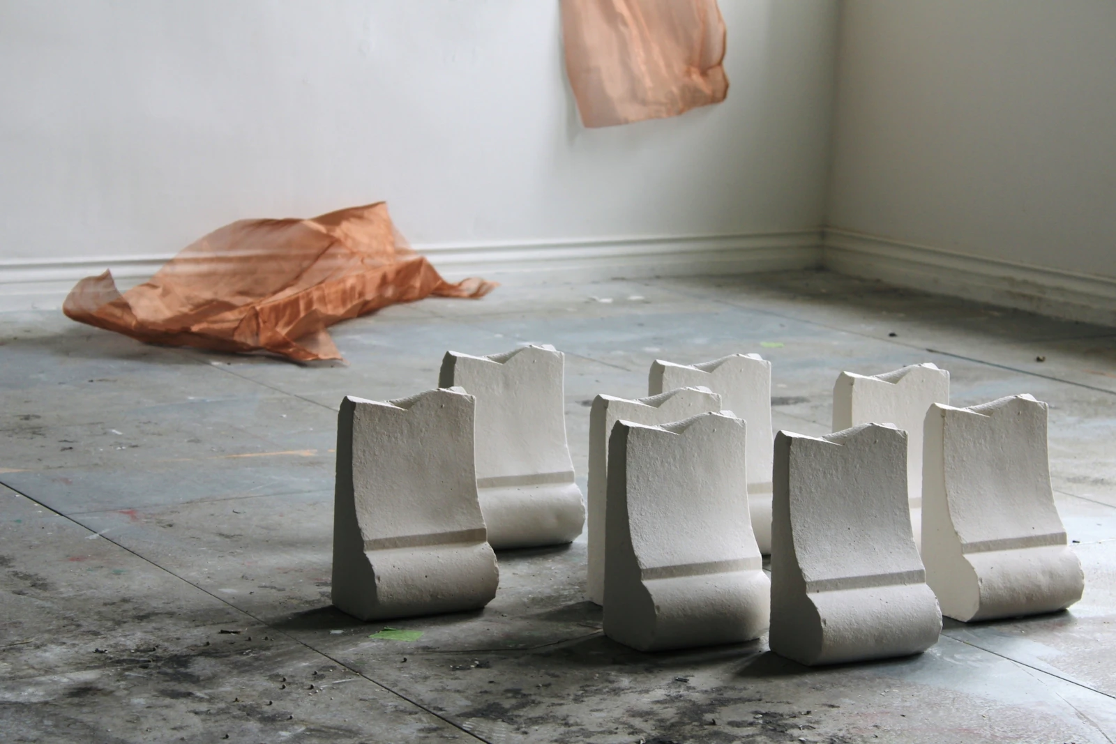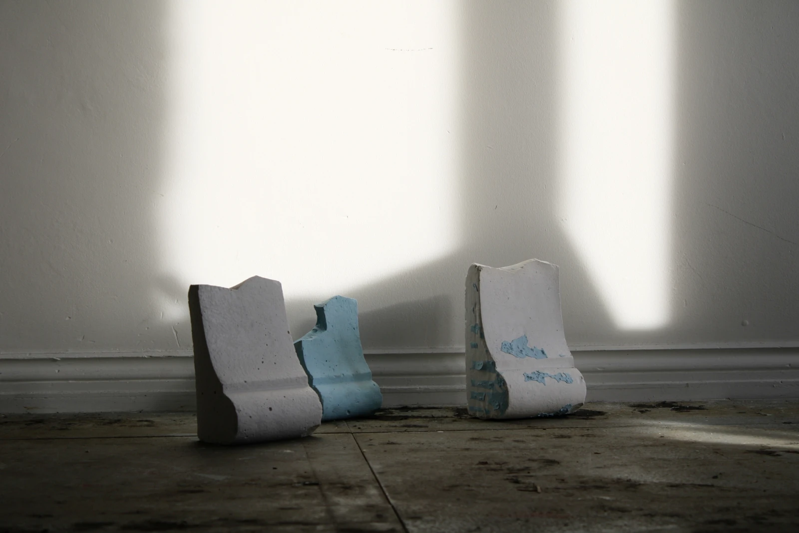 Images: Fabricated lintels bathing in studio rays. White plaster casts (lime, cement, gypsum, and talc) and blue and grey alginate casting media. Dimensions variable, Battersea studio view, London. April 2022