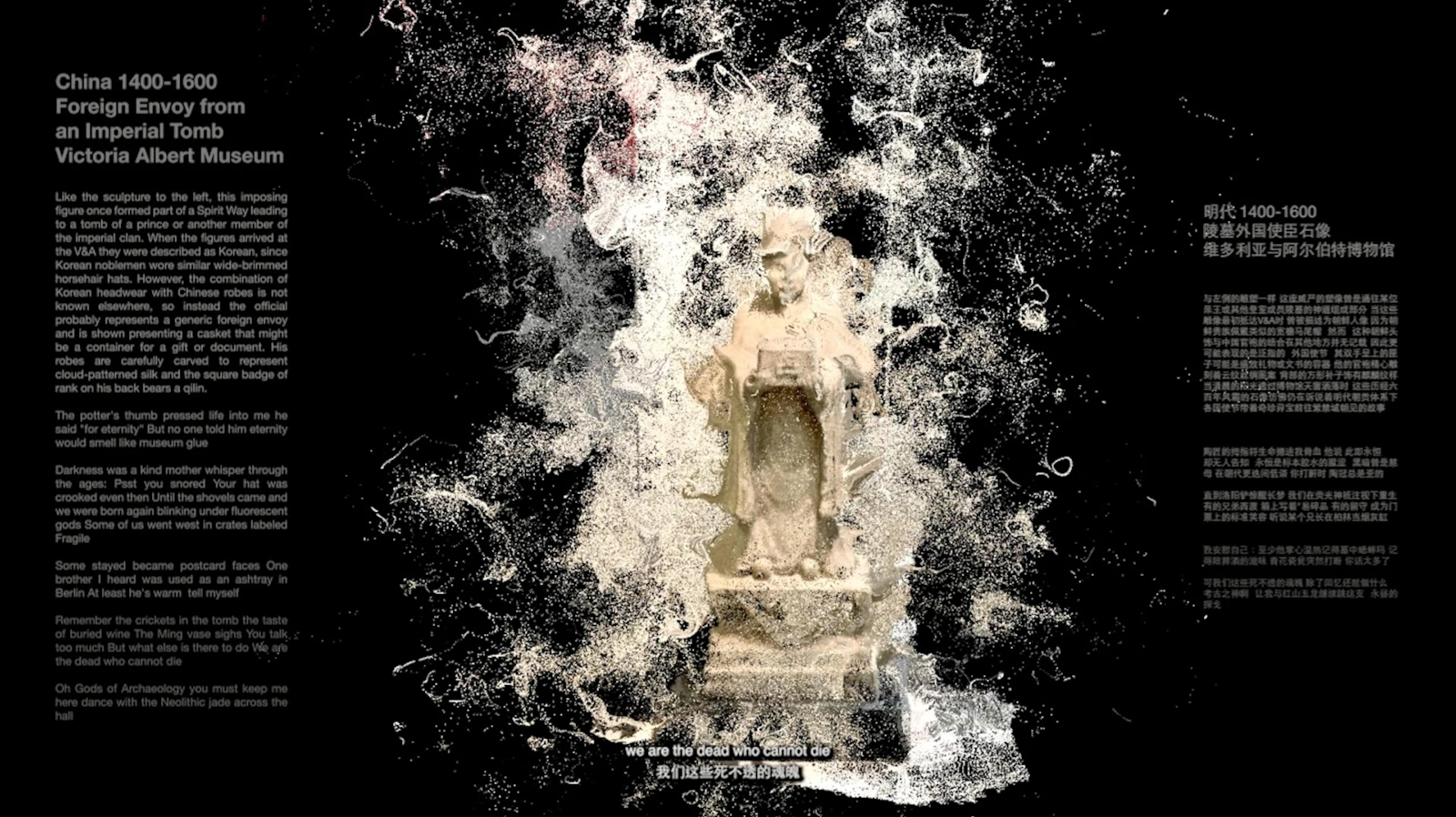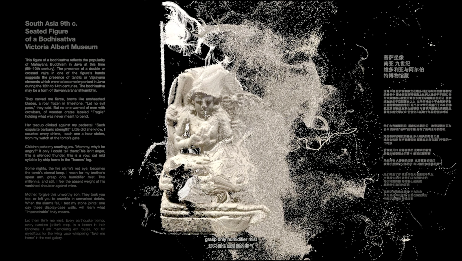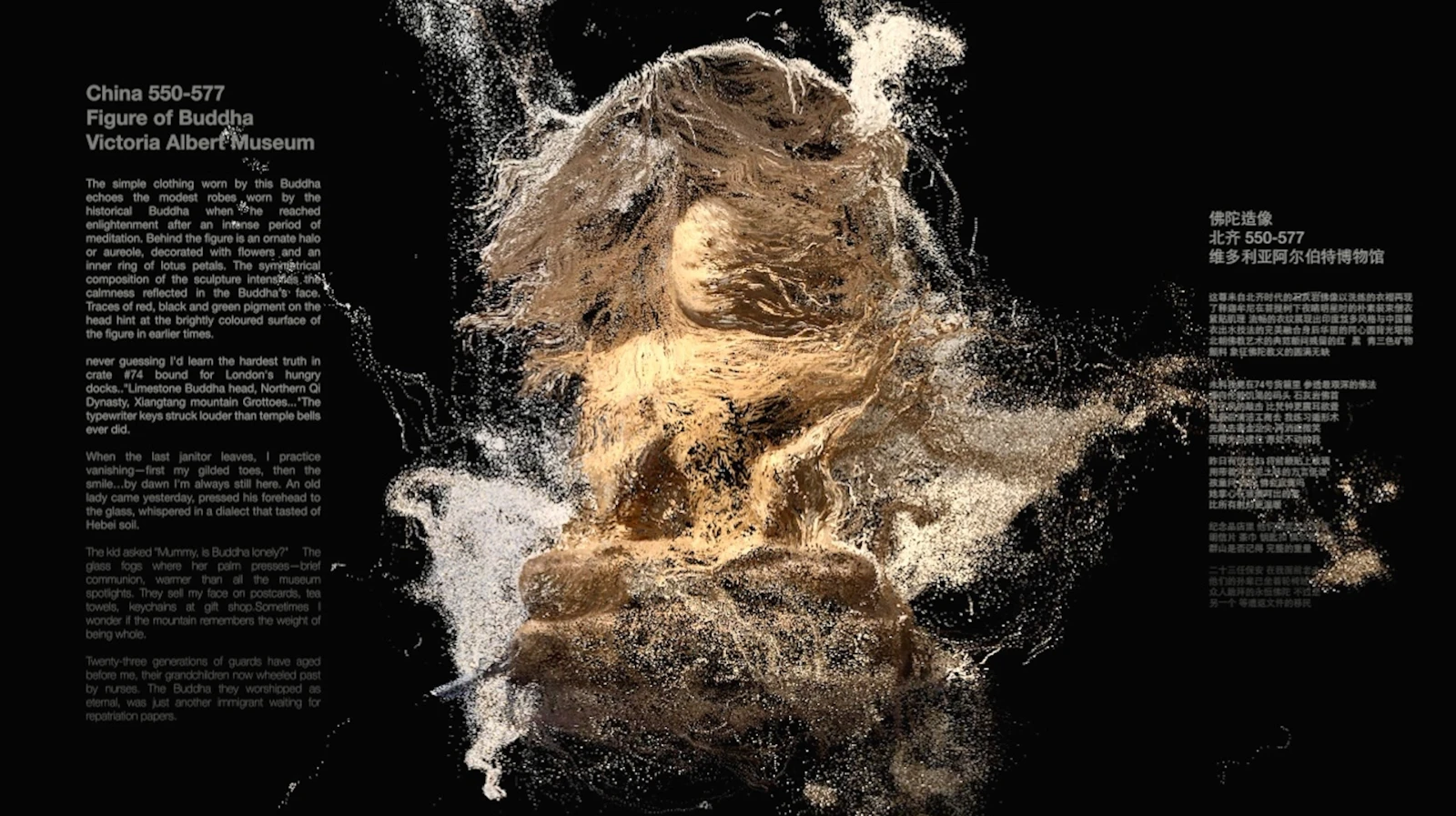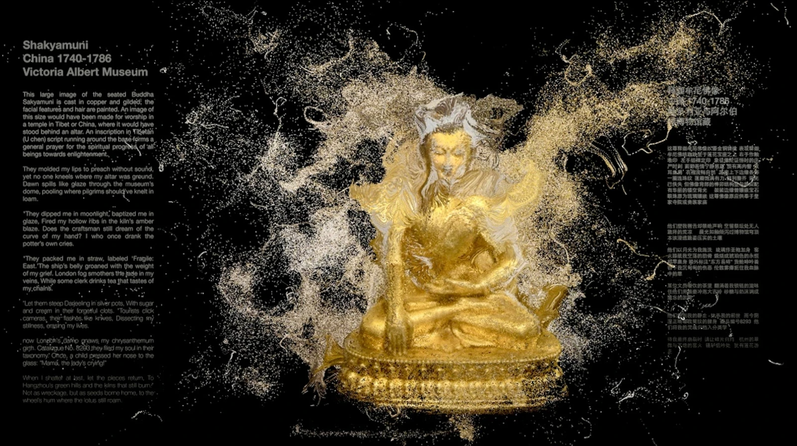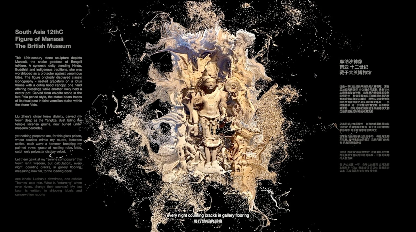 Suwen’s practice critically explores the “heritage empathy gap”—the emotional disconnection between audiences and artifacts severed from their original settings. Through AI-generated voice, text, and sound, combined with AR and 3D spatial media, his work transforms silenced objects into expressive narrative agents. By doing so, he challenges static museological displays and proposes new models of digital restitution, emotional engagement, and cross-cultural communication.