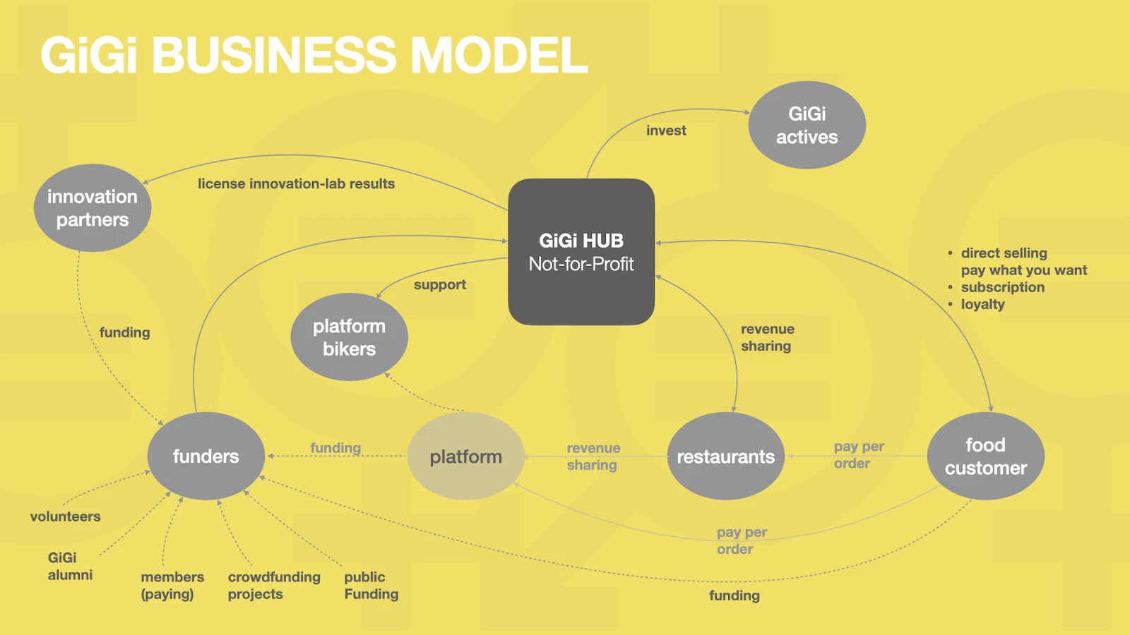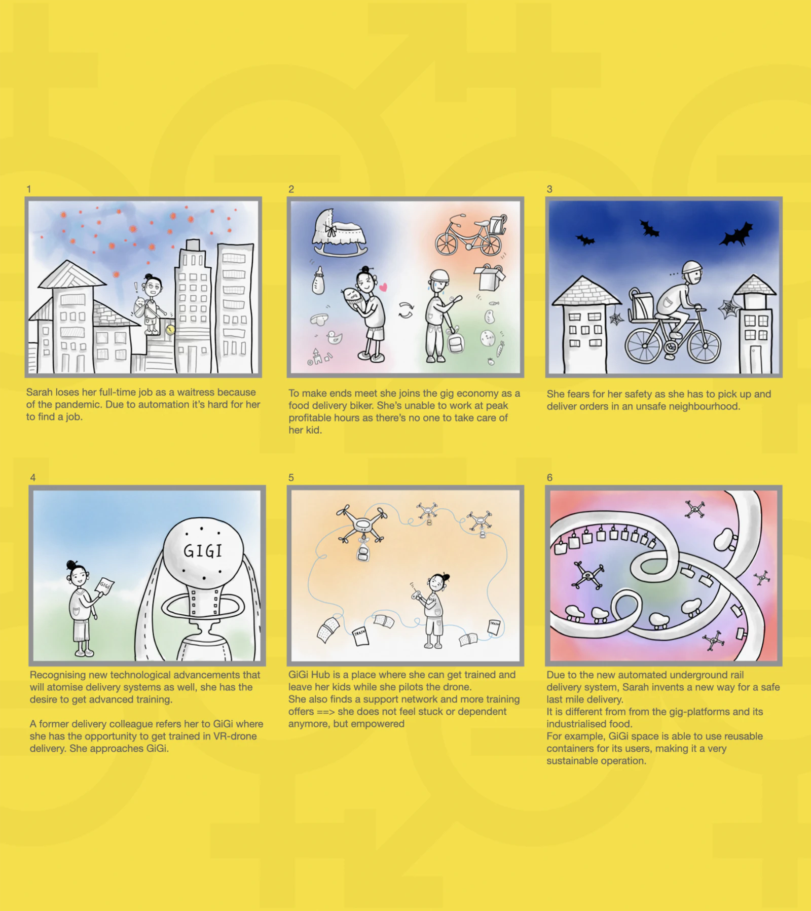 ‘GiGi’ tackles this issue through a physical and digital community hub that empowers women to develop beyond the current limitations of being (self-) employed in the food delivery sector. It aims to support female food delivery bikers to decouple from the sole dependency on algorithm-driven assignments of delivery orders. In the long-run, GiGi wants to develop women into innovators and entrepreneurs who will envision and realize how we will craft, deliver and share food in the future.