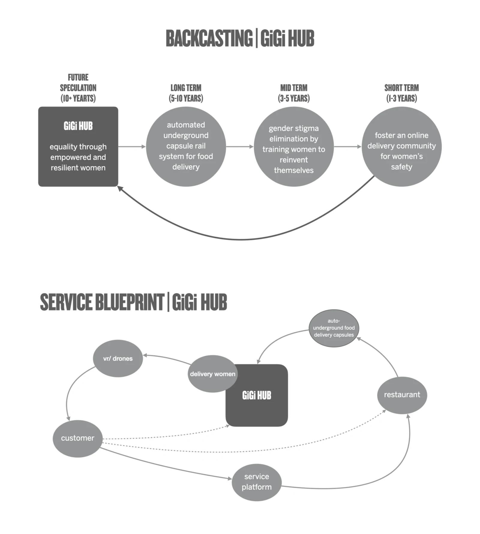 Our research focuses on ‘care’ and ‘futures’ and inquires how design can speculate safety and care, both as a discipline as well as a design strategy. By focusing on the lack of care the Gig Economy has for its workers and in particular women, we identified how failures of the food delivery sector creates unsafe working conditions for female workers. This is for example indicated by the lack of missing support for women when working in unsafe neighborhoods or a lack of safe zones for resting between orders, exchanging safer routes among co-workers and having access to washrooms.