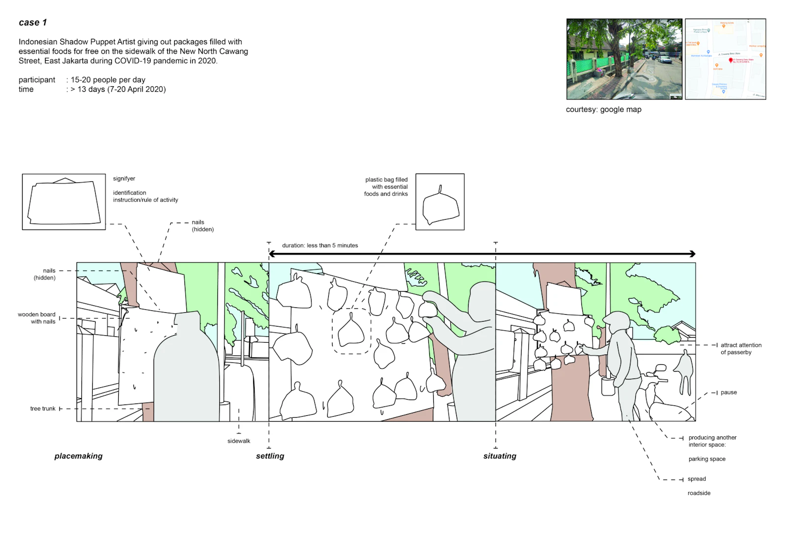 Most government policies about urban planning are oriented toward modernising Indonesia, which translates into absorbing everything ‘western’. This attitude to urban planning frames street inhabitation, which falls outside the canons of design, as practice with no intellectual preconception, hence having no cultural value nor meaning. This research argues that not only the citizens appropriating the street using interior practice know-how, street inhabitation also has a considerable socio-cultural impact on its surroundings. By organising various street inhabitation into a typology, this research aims to disclose its alternative spatial structures and mechanisms that make it an essential aspect of Jakarta’s urban fabric. Typology of actions is used to understand situation-based space that relies on everyday tactics and has no fixed shape. With the emphasis on actions, this form of convention focuses on grasping the intimate properties of space such as body and objects to device conceptual types of street inhabitation.