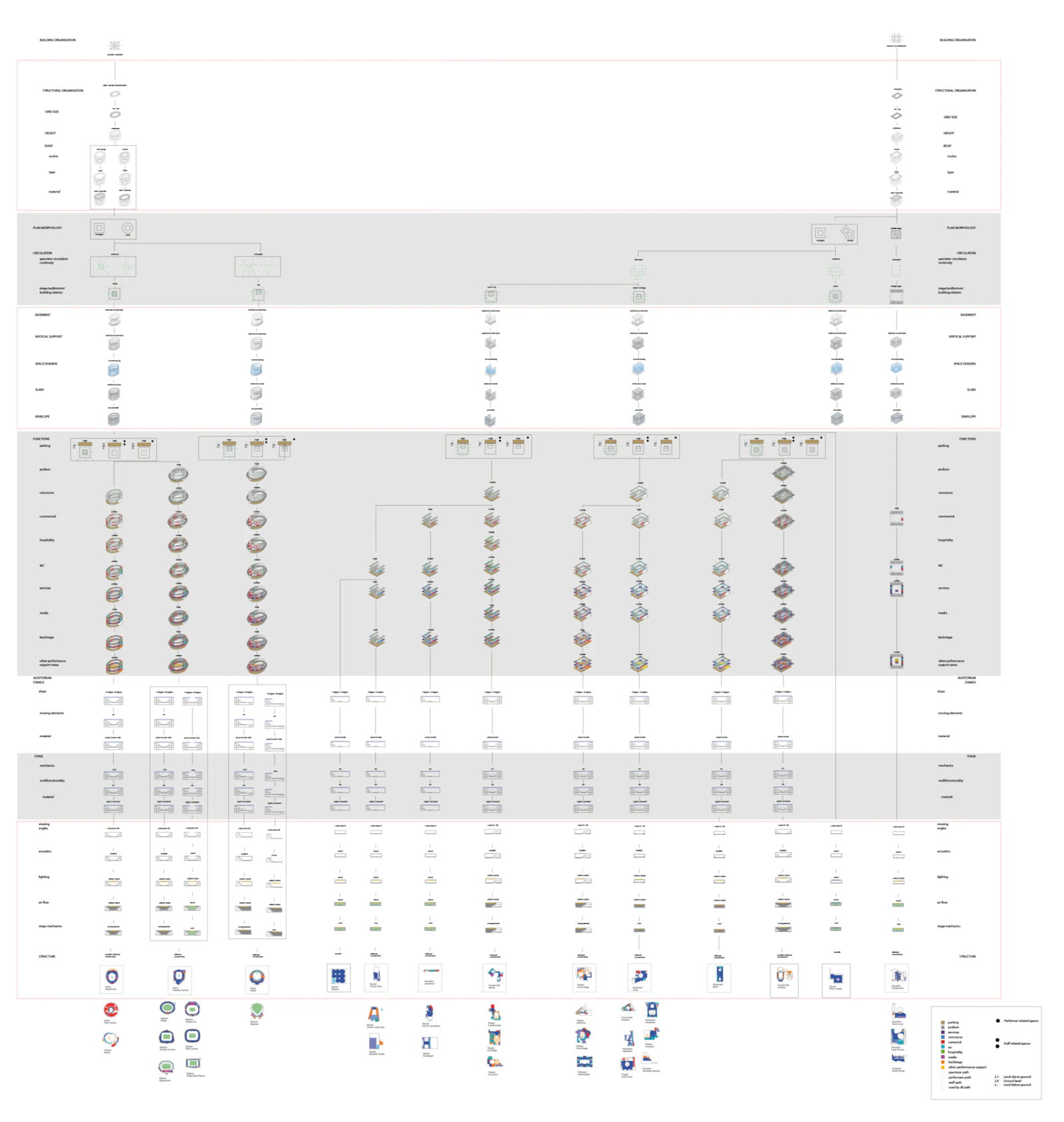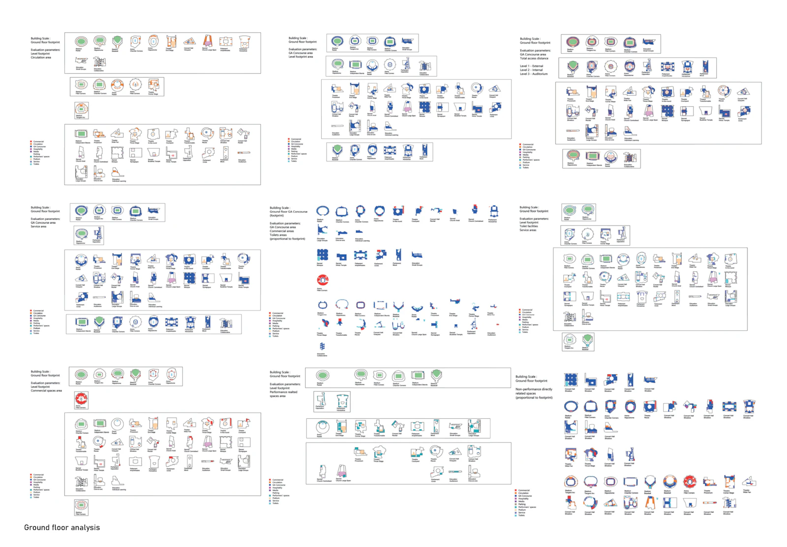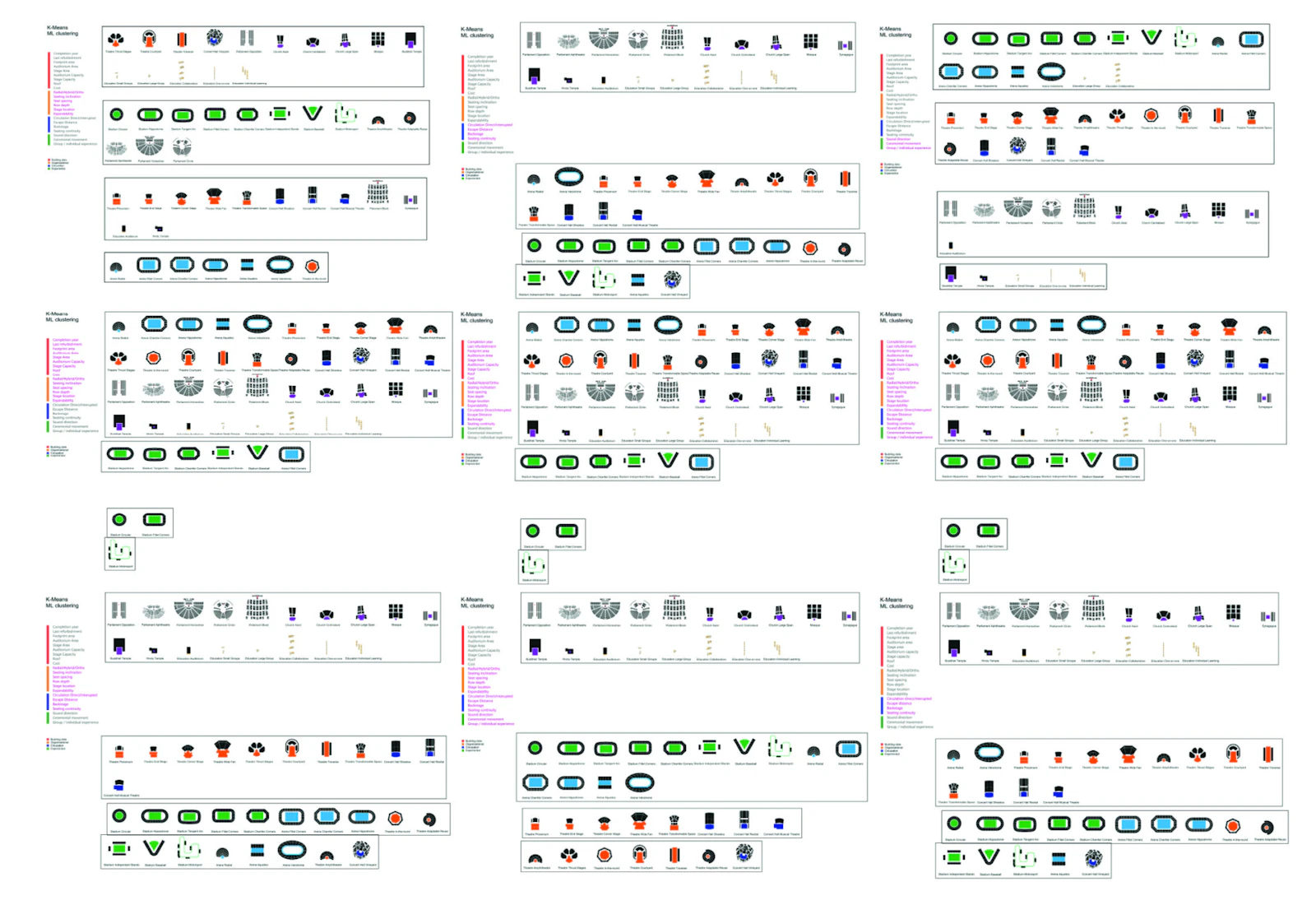 The project methodology uses approaches from both architectural and structural engineering fields. Due to the specific requirement for an input dataset for machine learning analysis the first stage of the research involved the construction of a typological framework through Grounded theory and the selection of an architectural category for further analysis. The initial typological analysis of the case studies explored the larger architectural genre of assembly buildings and through machine learning classification of architectural and structural plans and 3d models identified the most influential design drivers. These design parameters served for the construction of a hierarchy three for the classification of the case studies and the subsequent selection of research focus. In terms of organisational and morphological classification stadia presented distinct characteristics that are not present in the other examples of assembly buildings. In order to validate the design drivers the research also focused on the historical development of stadium design parameters and relevant legislation. The second phase of the research takes practical approaches from the field of structural engineering like algorithmic design and uses empirical study in order to validate the construction of an analytical machine learning model. This model is based on a parametric 3d model that generates simplified digital representations of the different morphological typologies. The parametric model is controlled with machine learning and evaluates the design efficiency through travel distances, distances to programmatic features, and sightline quality. The third phase of the research brings functional change to the machine learning model and explores the different morphological and organisational consequences of adaptability to changing requirements.