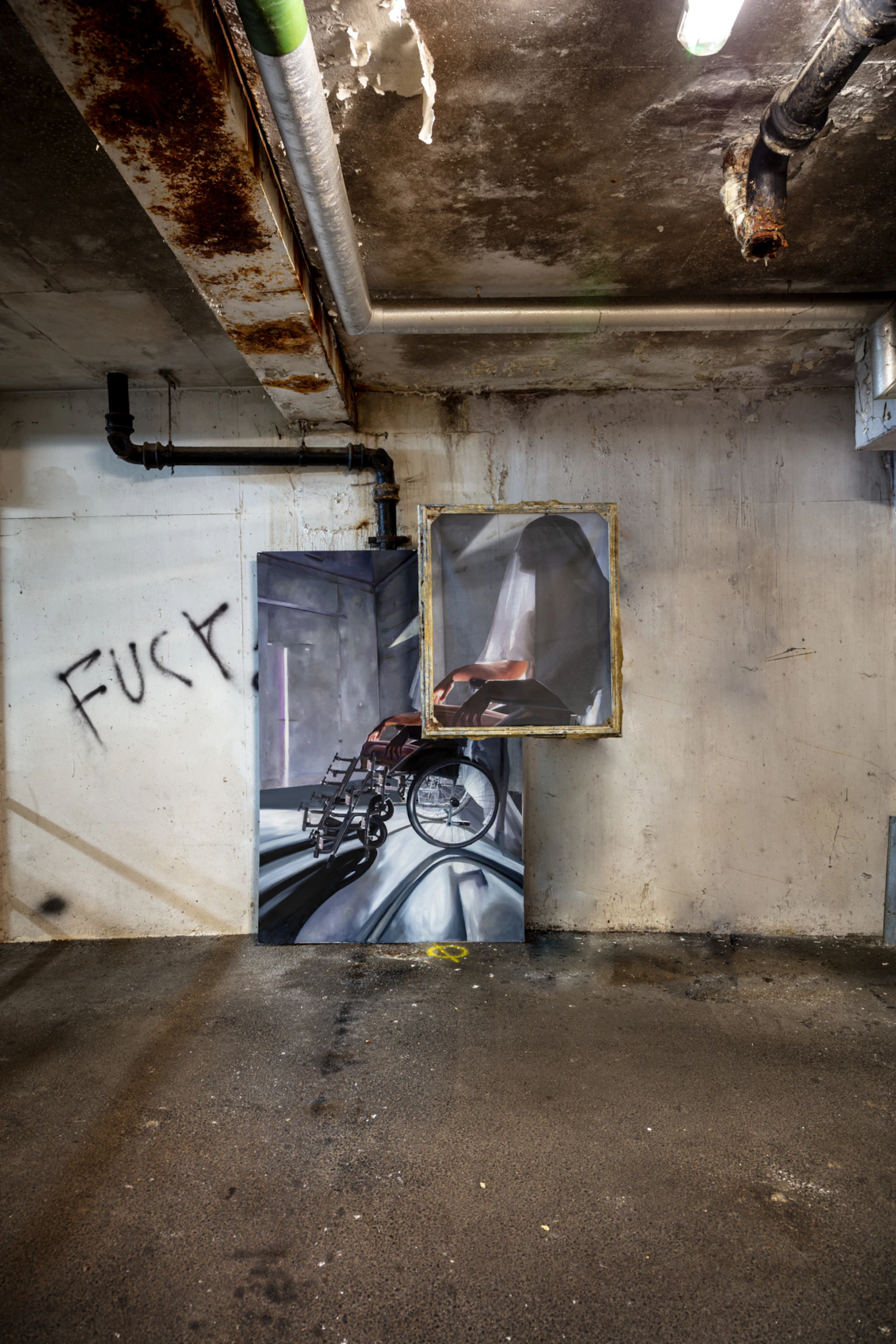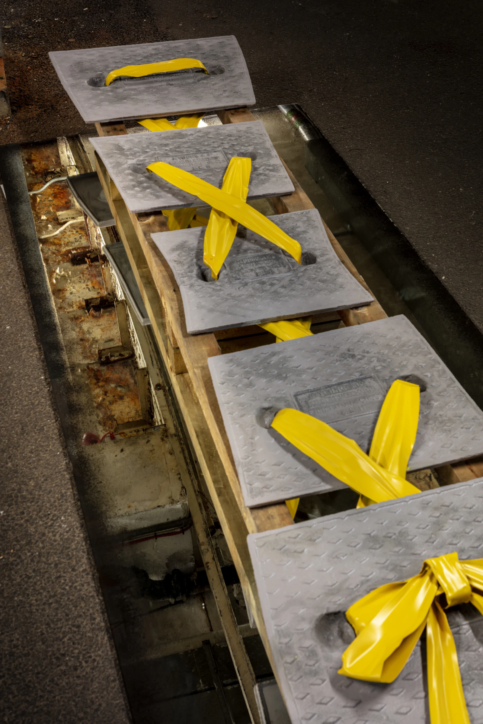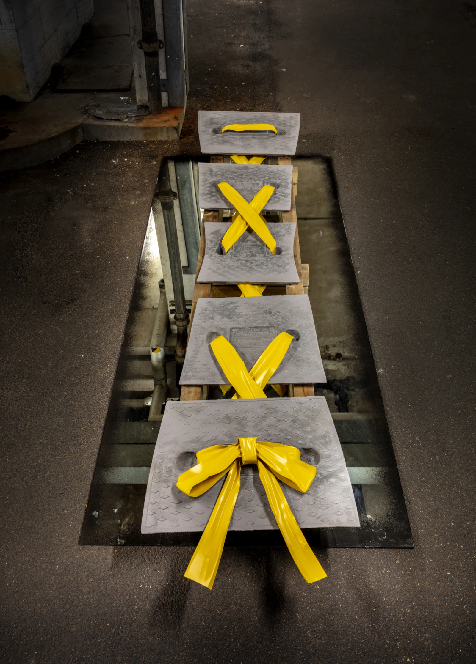 Manholes are constantly edited out of our vision, just like the fluorescent clad men that go into them. Subconsciously, these are the places and the people, that are invisible to us, as a society. Grad sees manholes as a portal of transformation and occurrence. They are the gates, separating up and down, good and bad, female and male. To her, manholes are the canvas for the imaginary, entrance to a utopian world free of binaries. They are a path to radical empathy. The shoes she paints on them are cobbled from different power tools, devoid of body.