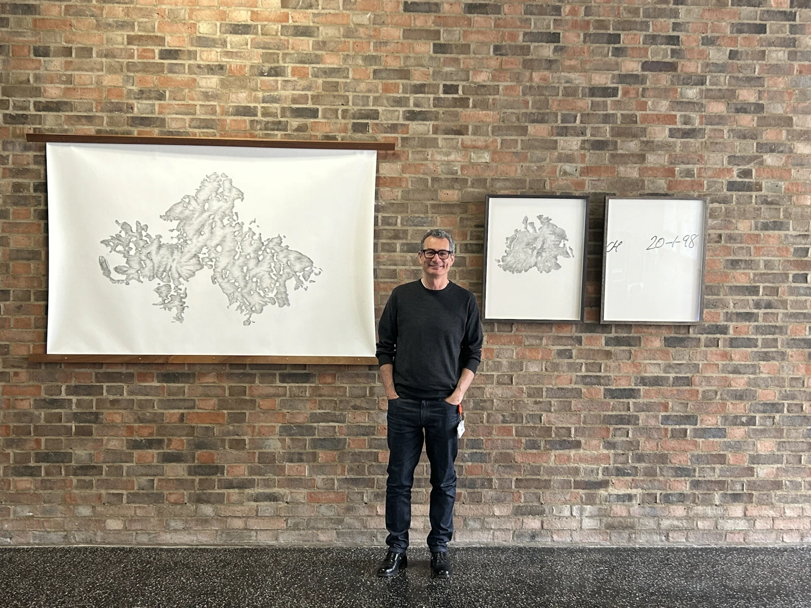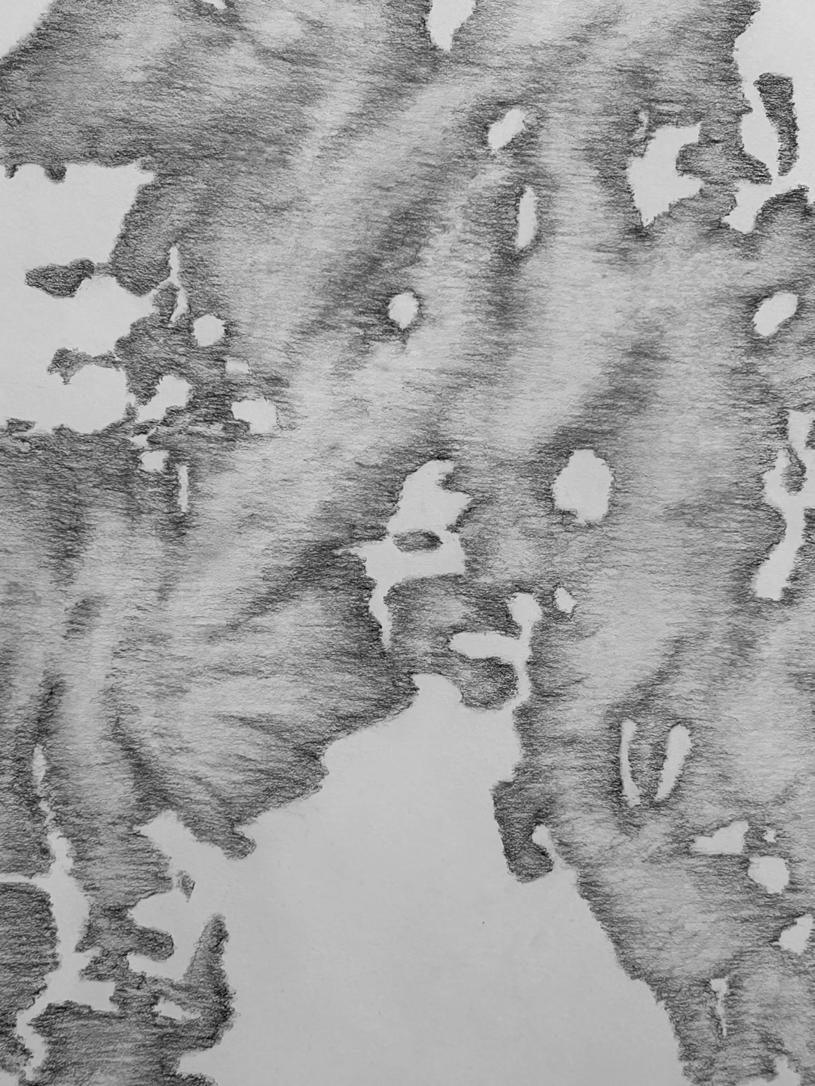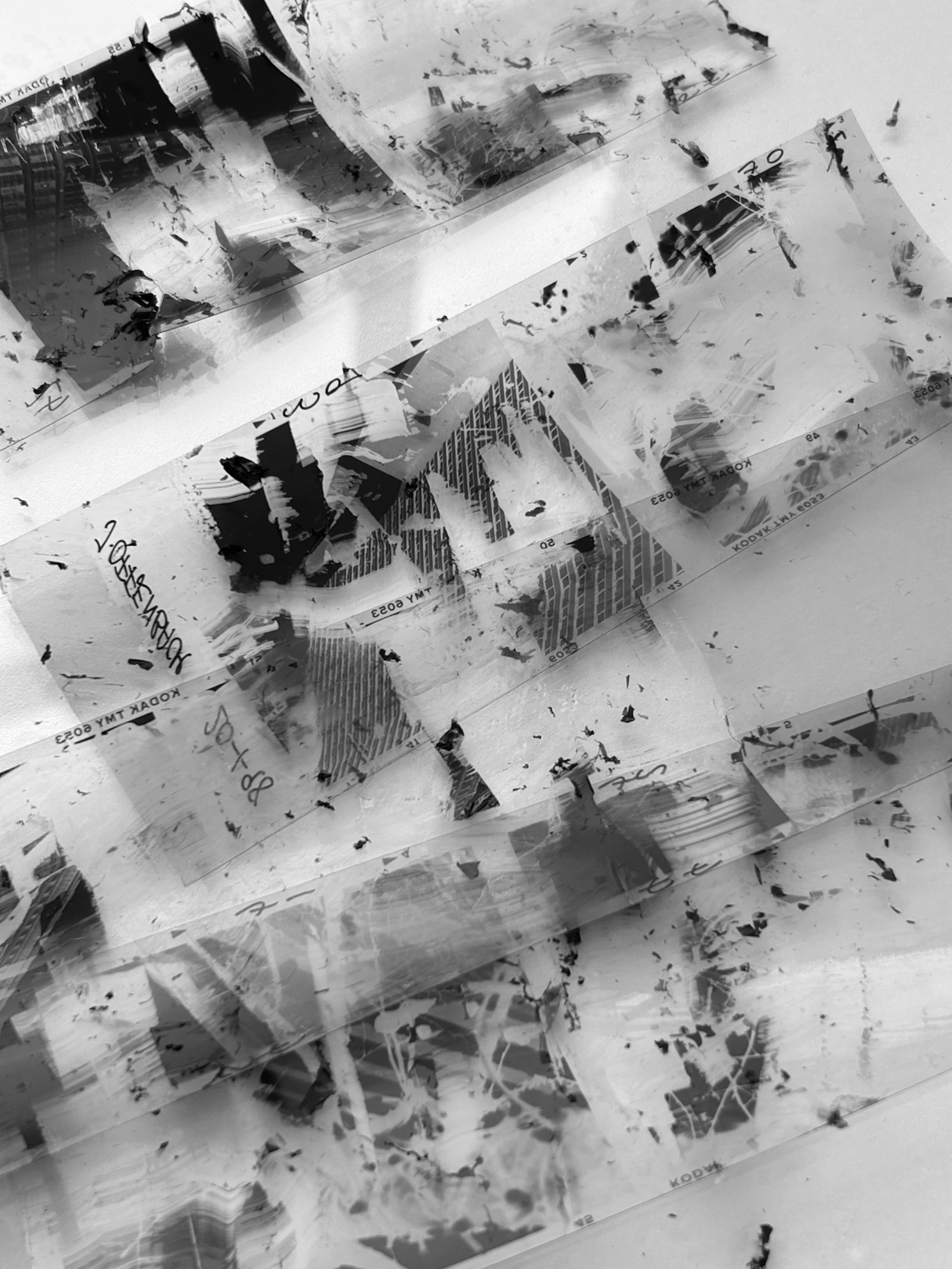 In the studio, for subject matter, I reference my original images. That stone staircase from Tanlay is one. Grain imagery from an electron microscope is another. And artefacts found on my negatives: from names, dates and notes jotted on the selvedge to scratchings and the razed remnants of the film itself, are all considered for reawakening. Everything has a new value. A new importance.