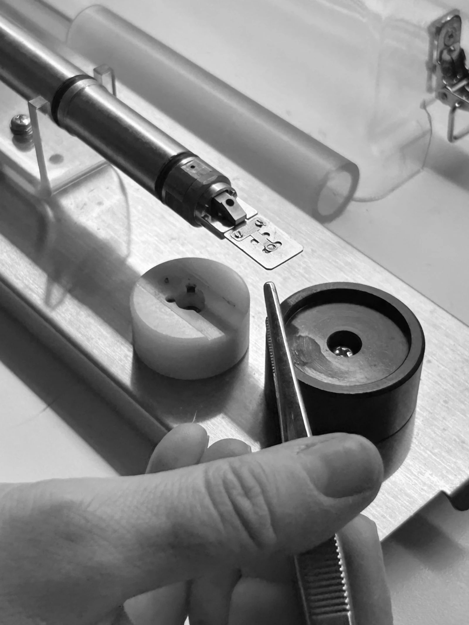 I am making isogenic artworks. First, I find a suitable negative from my archive. I have many, possibly hundreds. I like to find a negative that is old, highlighting the passage of time, and that is also of something specific and interesting; something memorable, in fact. This is important, because I will destroy the image. In doing so there is a jolt. It is not without some emotion that I remove the memory, the trace of the memory from the negative. Initially, I use a household tool. A blade on a plastic handle, the kind you can buy in any DIY shop. Having pre-soaked the negative in water, I scrape the blade slowly across its surface. The gel slips off easily and resembles a gossamer-thin black slippery membrane.