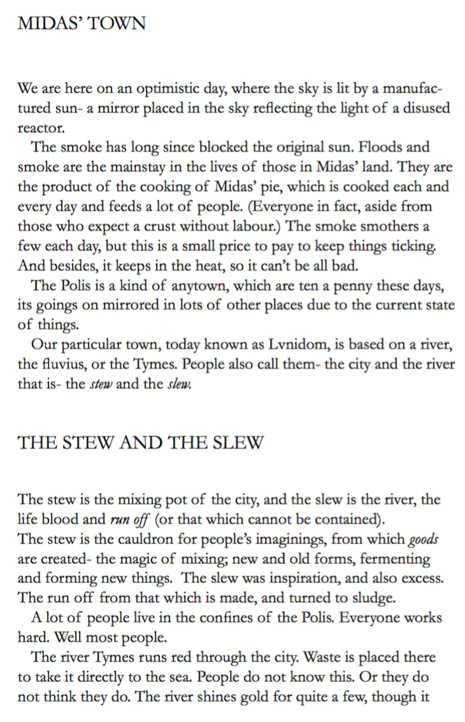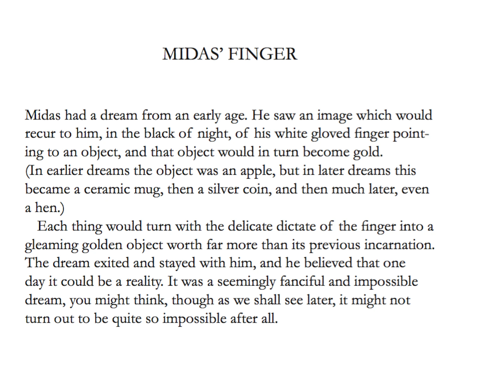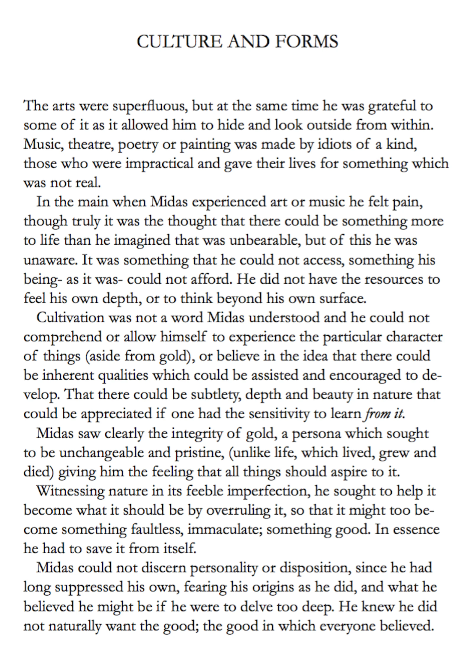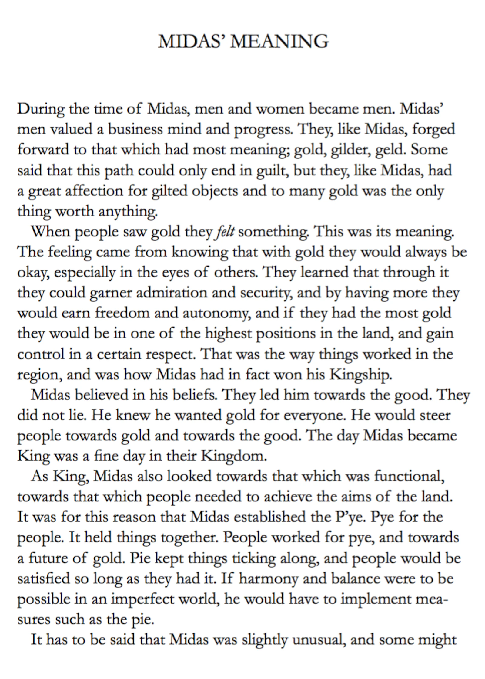 The myth of the CUT, an allegory of the birth of matter, unfolds the genesis of Midas (via morphology in language), and the Stew and the Slew (a ‘fairy story’ by the fictional Quintillius Quintillian), tells the ironic tale of the king whose original (irrational) love of gold, morphs into the pursuit of money then power, mining the secrets of matter, in order to reform existence (to overcome death), resulting in the de-formation, mutation and sacrifice of life. Midas' inability to see what is really at stake, can be seen to be based in a traumatised perception, which has led to a peculiar interpretation of the elements of the world, and arguably a misunderstanding of the relationship between form, substance (and essence).*