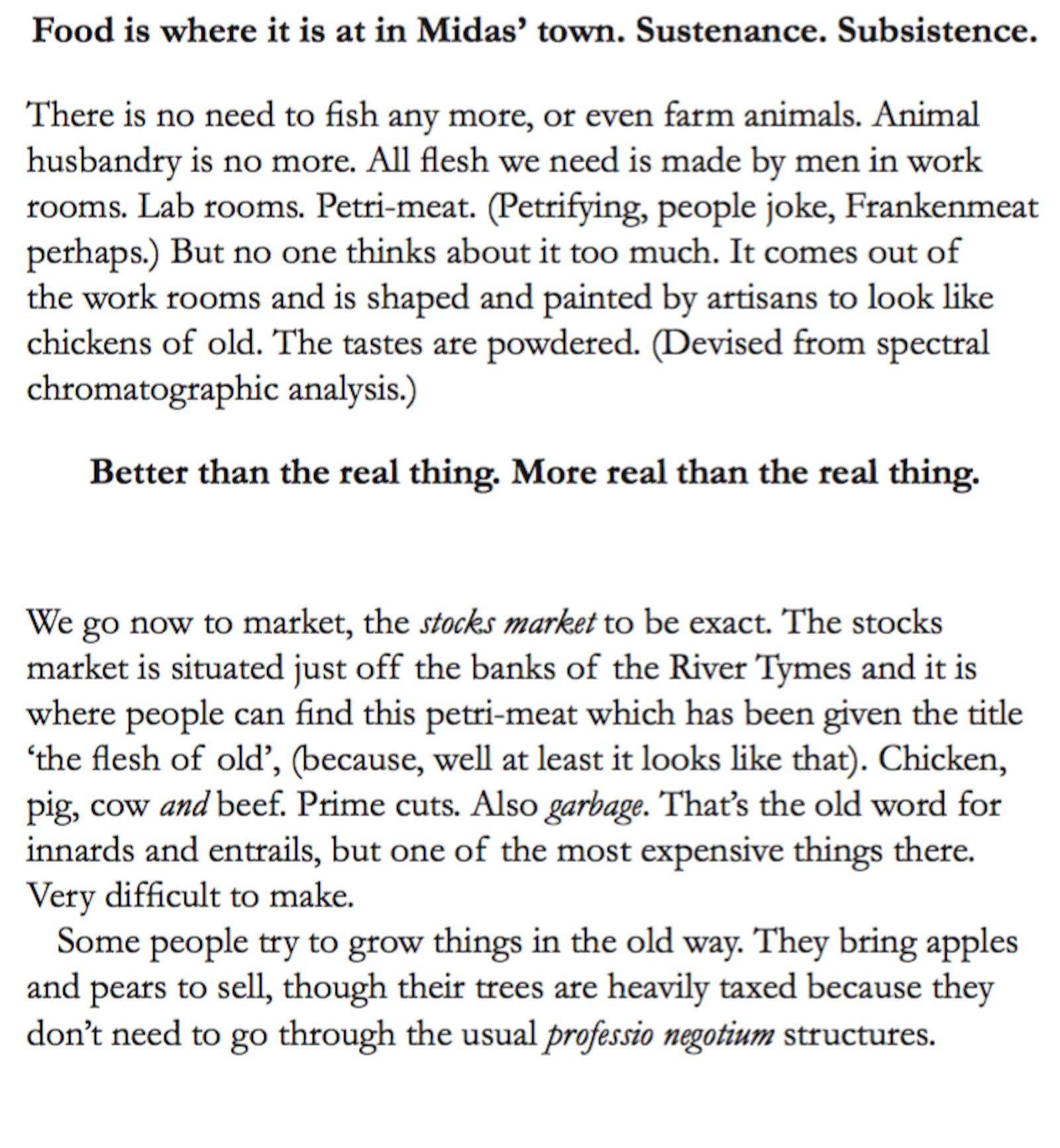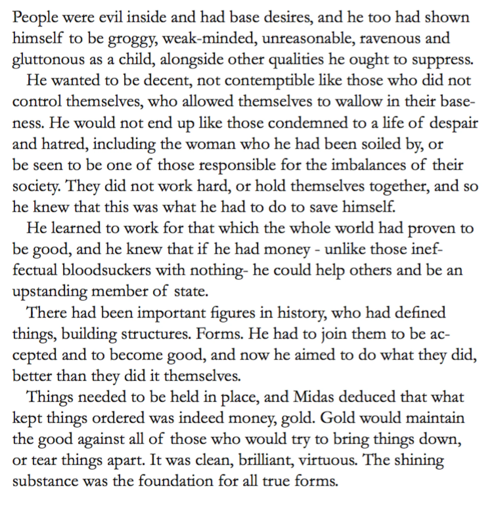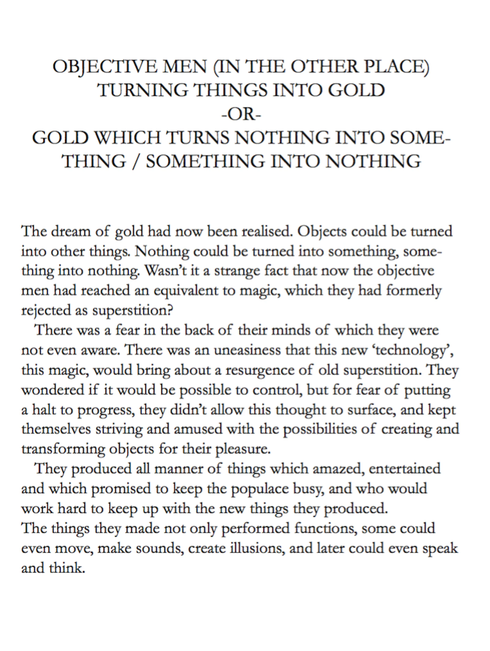 The myth of the CUT, an allegory of the birth of matter, unfolds the genesis of Midas (via morphology in language), and the Stew and the Slew (a ‘fairy story’ by the fictional Quintillius Quintillian), tells the ironic tale of the king whose original (irrational) love of gold, morphs into the pursuit of money then power, mining the secrets of matter, in order to reform existence (to overcome death), resulting in the de-formation, mutation and sacrifice of life. Midas' inability to see what is really at stake, can be seen to be based in a traumatised perception, which has led to a peculiar interpretation of the elements of the world, and arguably a misunderstanding of the relationship between form, substance (and essence).*