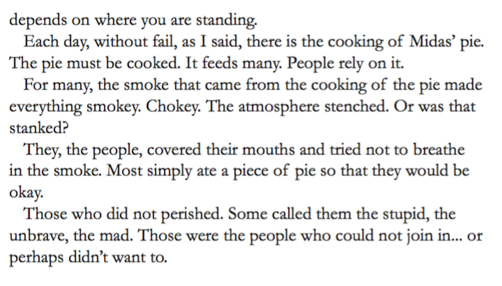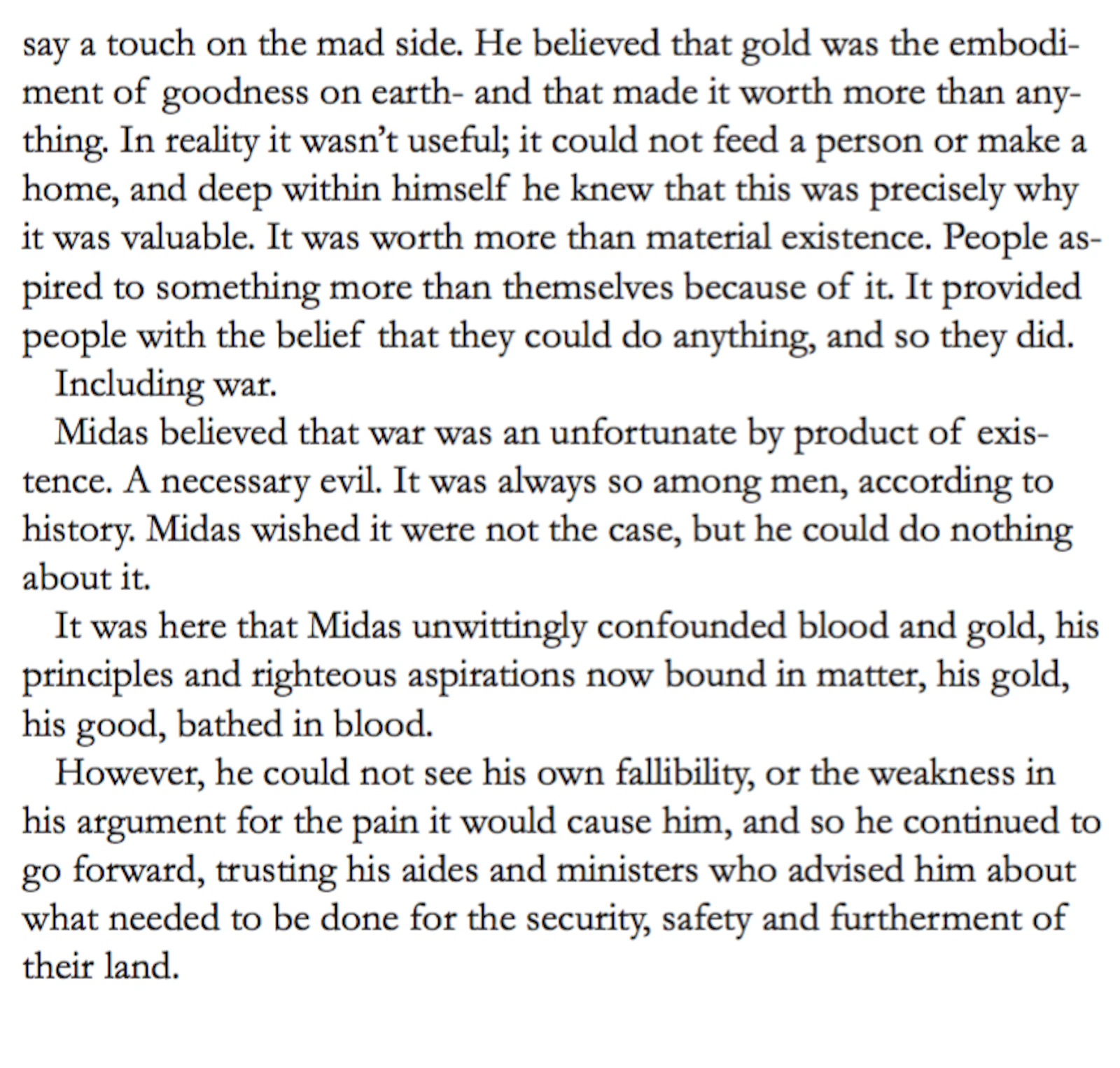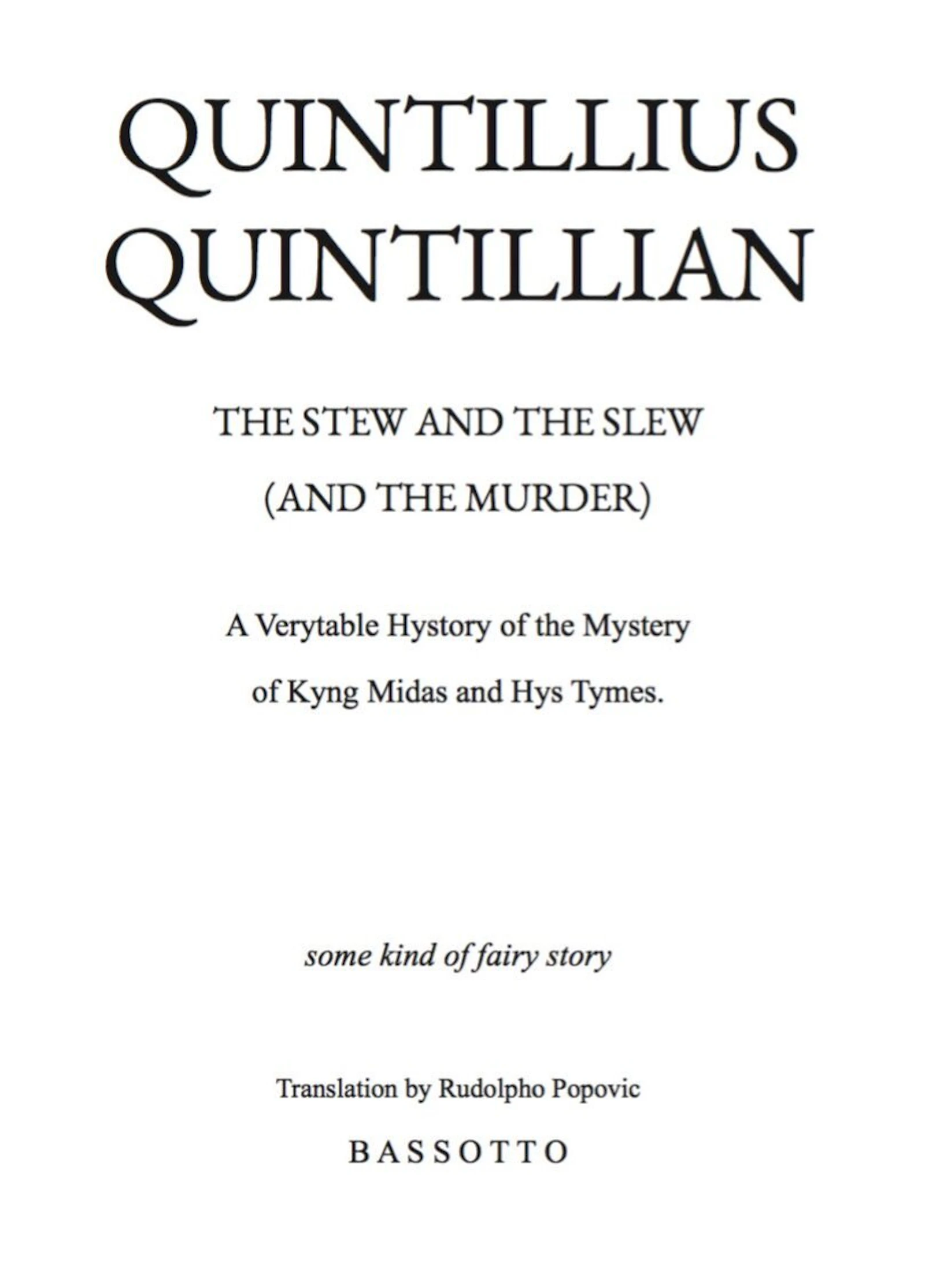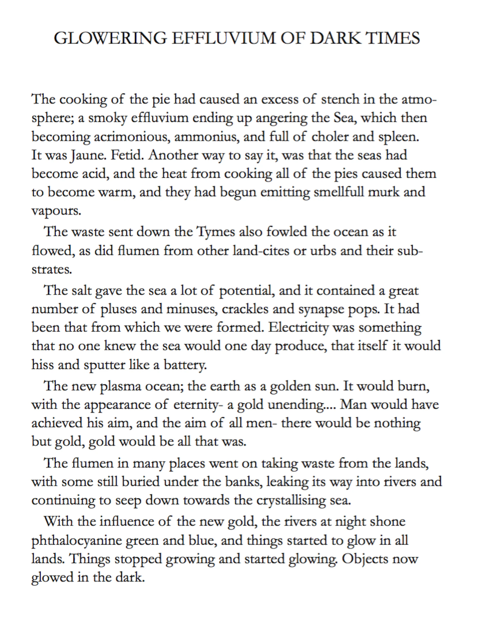 The myth of the CUT, an allegory of the birth of matter, unfolds the genesis of Midas (via morphology in language), and the Stew and the Slew (a ‘fairy story’ by the fictional Quintillius Quintillian), tells the ironic tale of the king whose original (irrational) love of gold, morphs into the pursuit of money then power, mining the secrets of matter, in order to reform existence (to overcome death), resulting in the de-formation, mutation and sacrifice of life. Midas' inability to see what is really at stake, can be seen to be based in a traumatised perception, which has led to a peculiar interpretation of the elements of the world, and arguably a misunderstanding of the relationship between form, substance (and essence).*