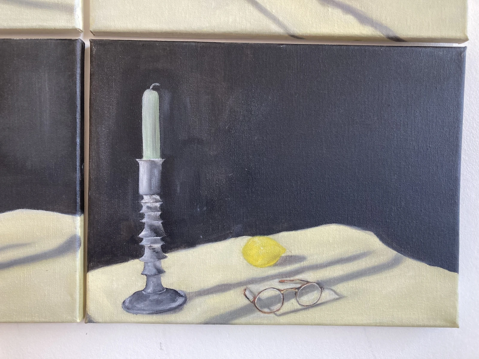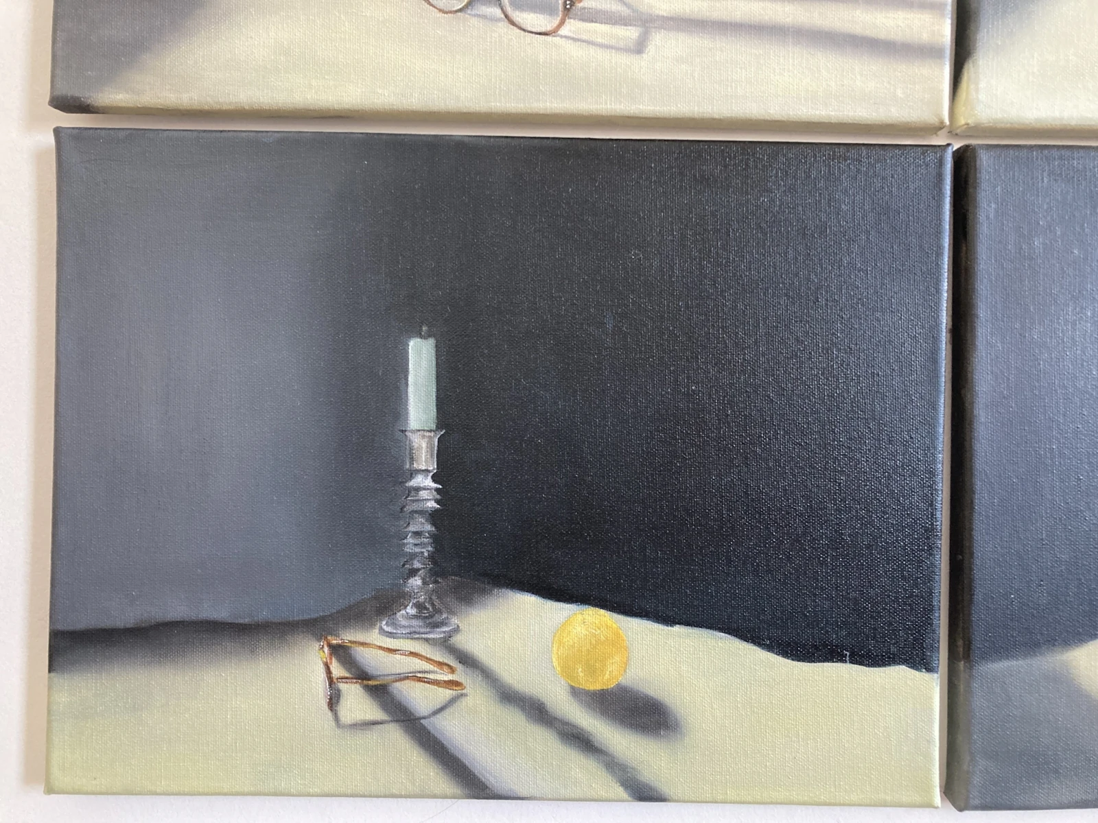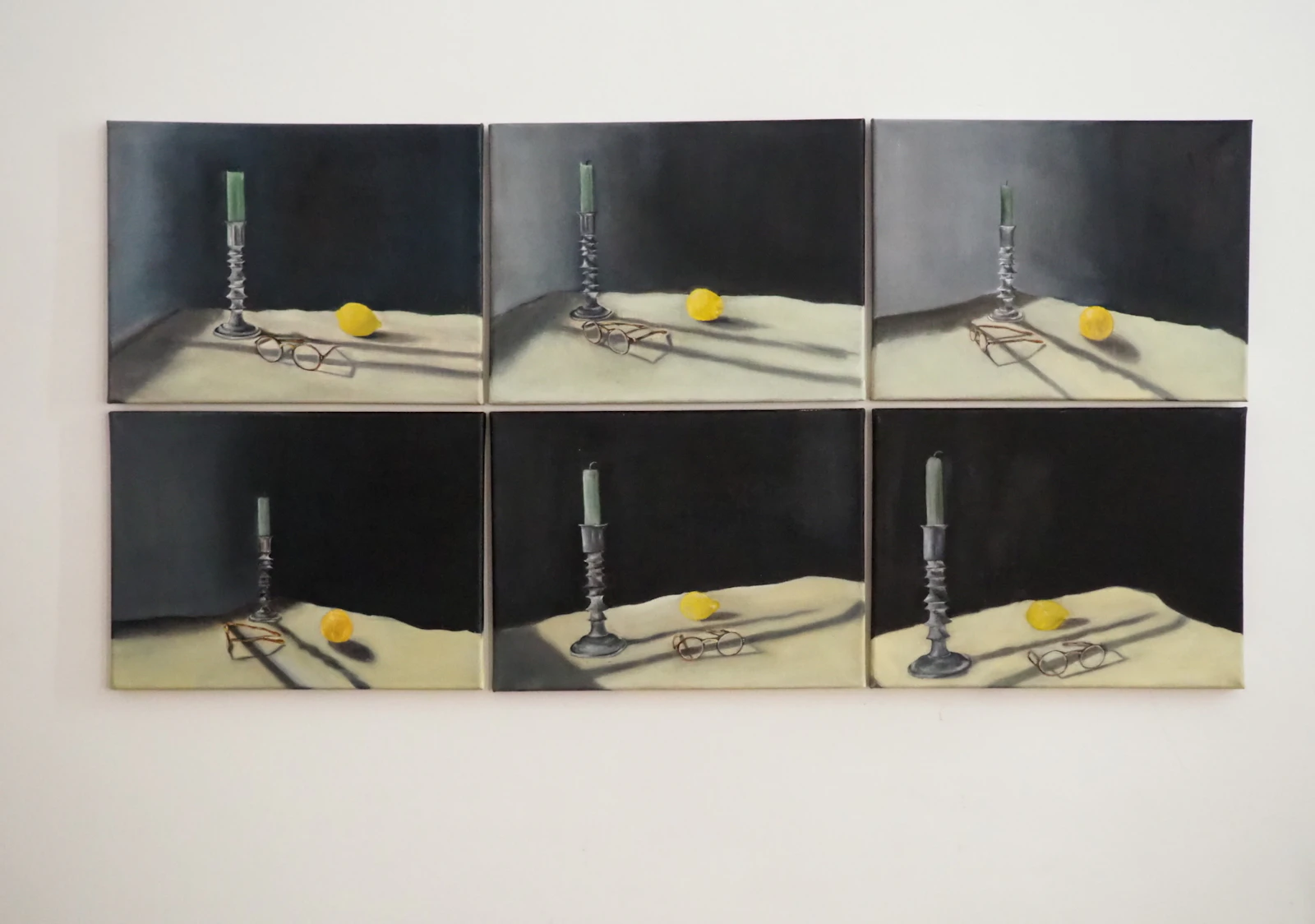 I began this piece by setting up a still life scene with my three symbols of the preservation of observation - lemons, candles and glasses. I took upwards of sixty photographs of the set-up from a multitude of angles. The next step was deciding how many, and which, photographs to select to be translated into paint. I was tasked with choosing a set of images which worked to form a depiction which, together, captures the multitudinal perspectives which form our engagement with a single moment. Unusually, I was not choosing each painting based on individual beauty and a balanced composition, but on the way in which six canvases worked together to form a whole.