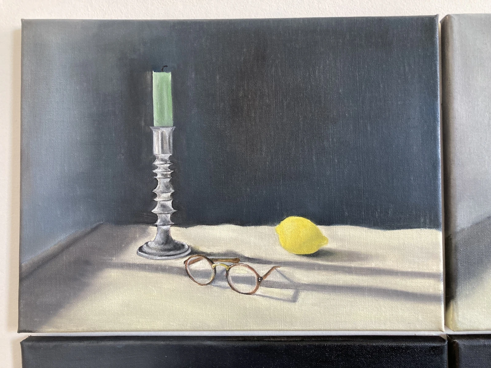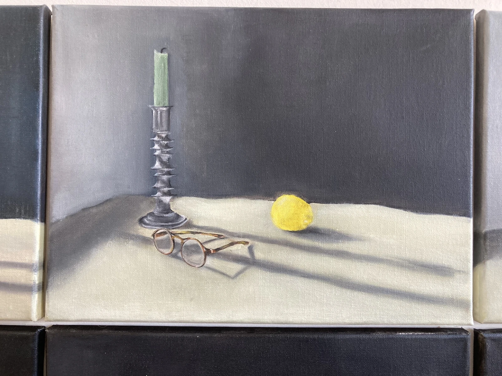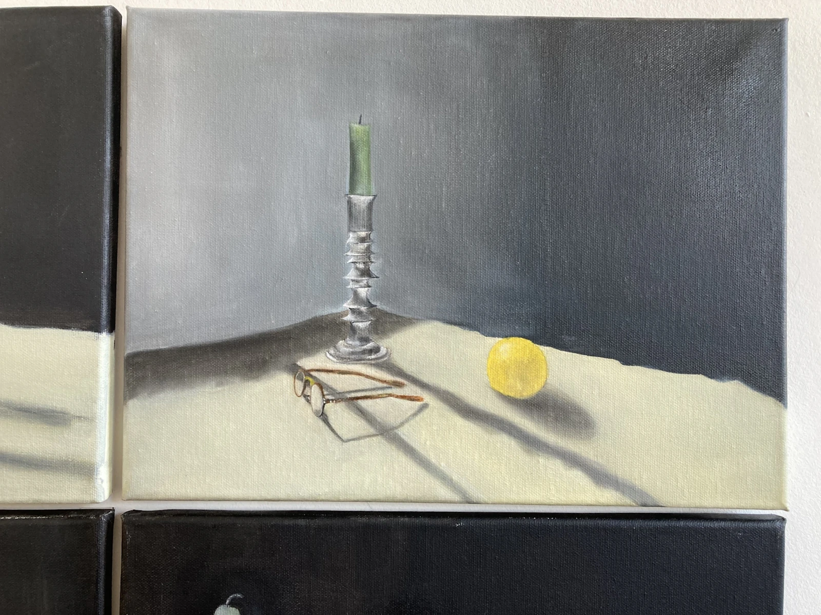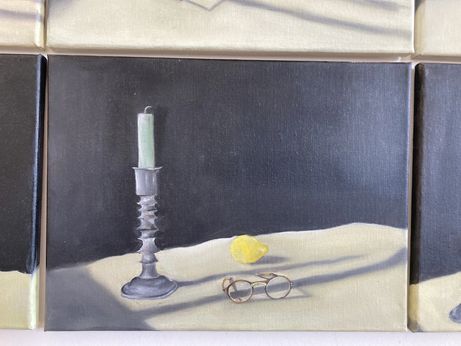 I began this piece by setting up a still life scene with my three symbols of the preservation of observation - lemons, candles and glasses. I took upwards of sixty photographs of the set-up from a multitude of angles. The next step was deciding how many, and which, photographs to select to be translated into paint. I was tasked with choosing a set of images which worked to form a depiction which, together, captures the multitudinal perspectives which form our engagement with a single moment. Unusually, I was not choosing each painting based on individual beauty and a balanced composition, but on the way in which six canvases worked together to form a whole.