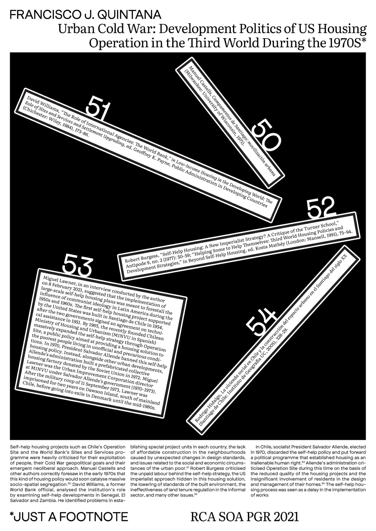 This research examines several institutional, national, and personal archives –such as the World Bank, USAID and John Turner’s files. While looking at these collections, this thesis builds on a series of new interviews held with architects, planners and politicians of the period. It investigates newspapers and specialised literature such as magazines, journals, critical reviews, and exhibition catalogues, among other documents.
