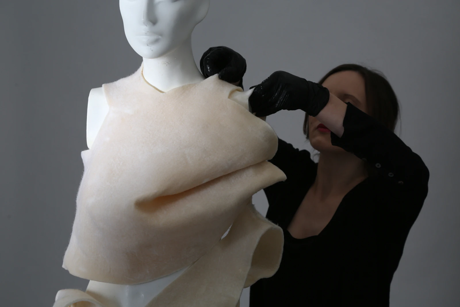 Inciperem or ‘I begin’ used interpretative performance and poetry to represent the processes that bacterial cellulose undergoes in order to form into a biomaterial. The intention of employing these artistic, qualitative methods was to interrogate the development of a biophilic consciousness to development an empathetic relationship towards materials. The waistcoat was made in collaboration with synthetic biologists at Imperial College using laboratory-grown, functionalised bacterial cellulose. Sections were coated in green fluorescent protein originally extracted from the Aequorea jellyfish, to produce a biological form of wearable technology – glowing under ultraviolet light.